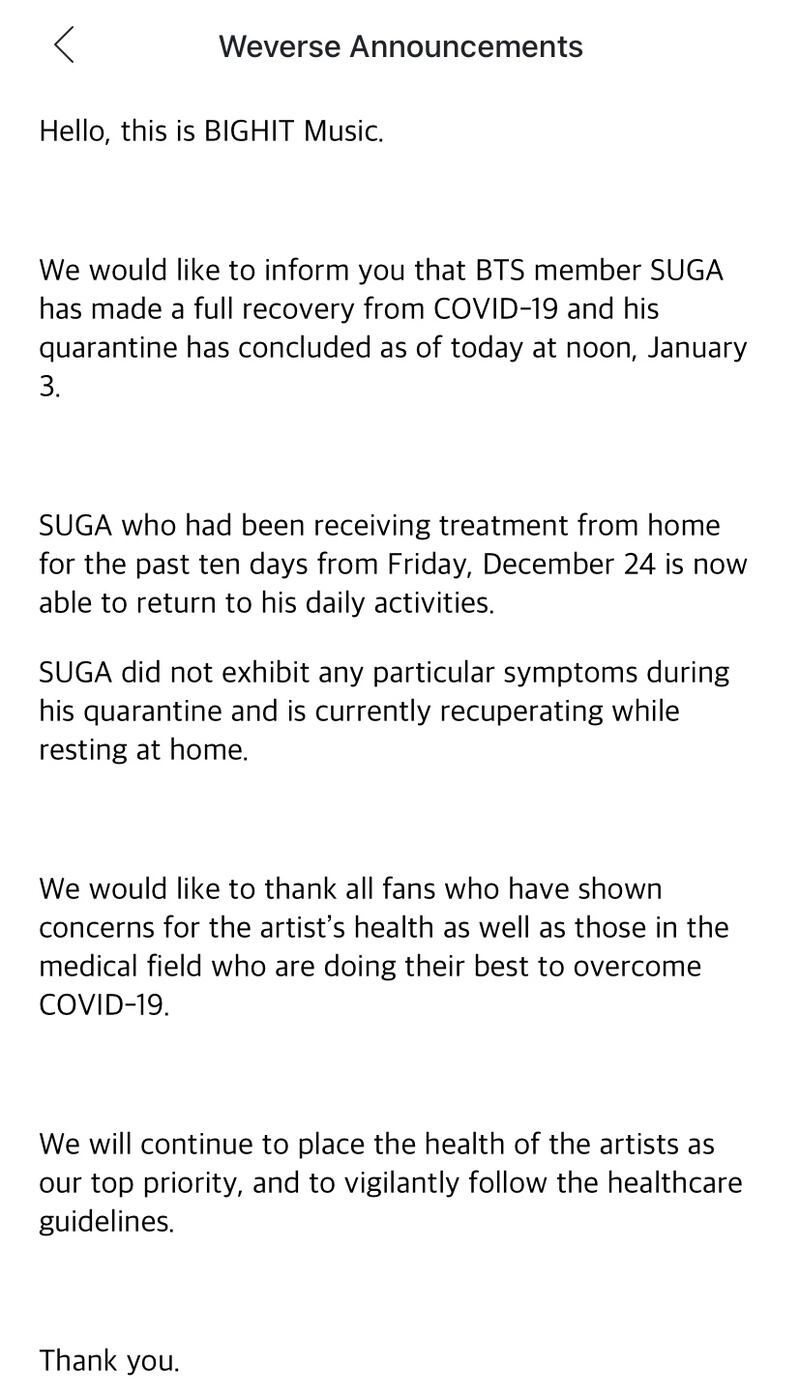 Nos gustaría informarle que el miembro de BTS SUGA se ha recuperado por completo de COVID-19 y su cuarentena ha concluido a partir de hoy al mediodía, 3 de enero.