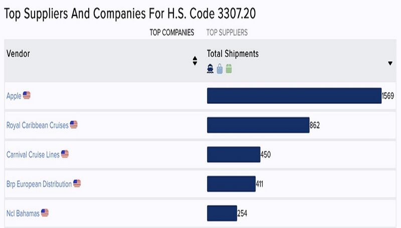 De acuerdo a las estadísticas que publica el portal citado, Apple ha recibido unos 1569 envíos de productos relacionados a las fragancias y desodorantes desde el 2015. En el mismo periodo de tiempo su más cercano seguidor, precisamente Royal Caribbean Cruises, obtuvo 862.