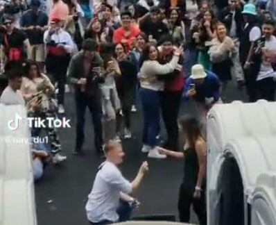 La chica se mostró sorprendida, no solo por el ofrecimiento de matrimonio de su novio gringo, sino por los gritos y emoción de la gente que los ovacionaba.