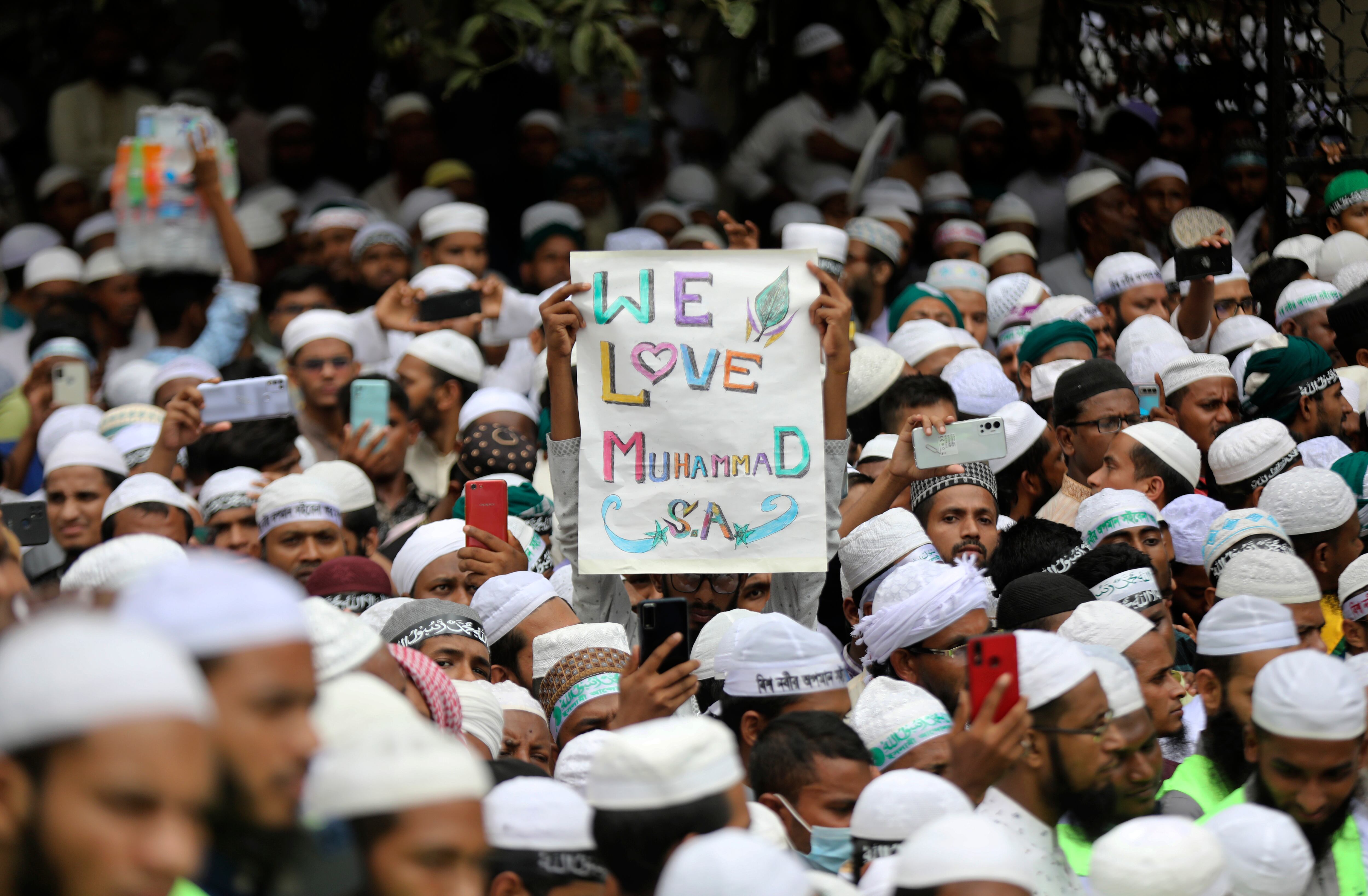 Los manifestantes reclamaron que los países de mayoría musulmana boicotearan los productos indios y cortaran lazos con Nueva Delhi, y que el primer ministro de Bangladesh, Sheikh Hasina, condenara públicamente los comentarios realizados unos días antes por dos miembros del Partido Bharatiya Janata del primer ministro de India, Narendra Modi.