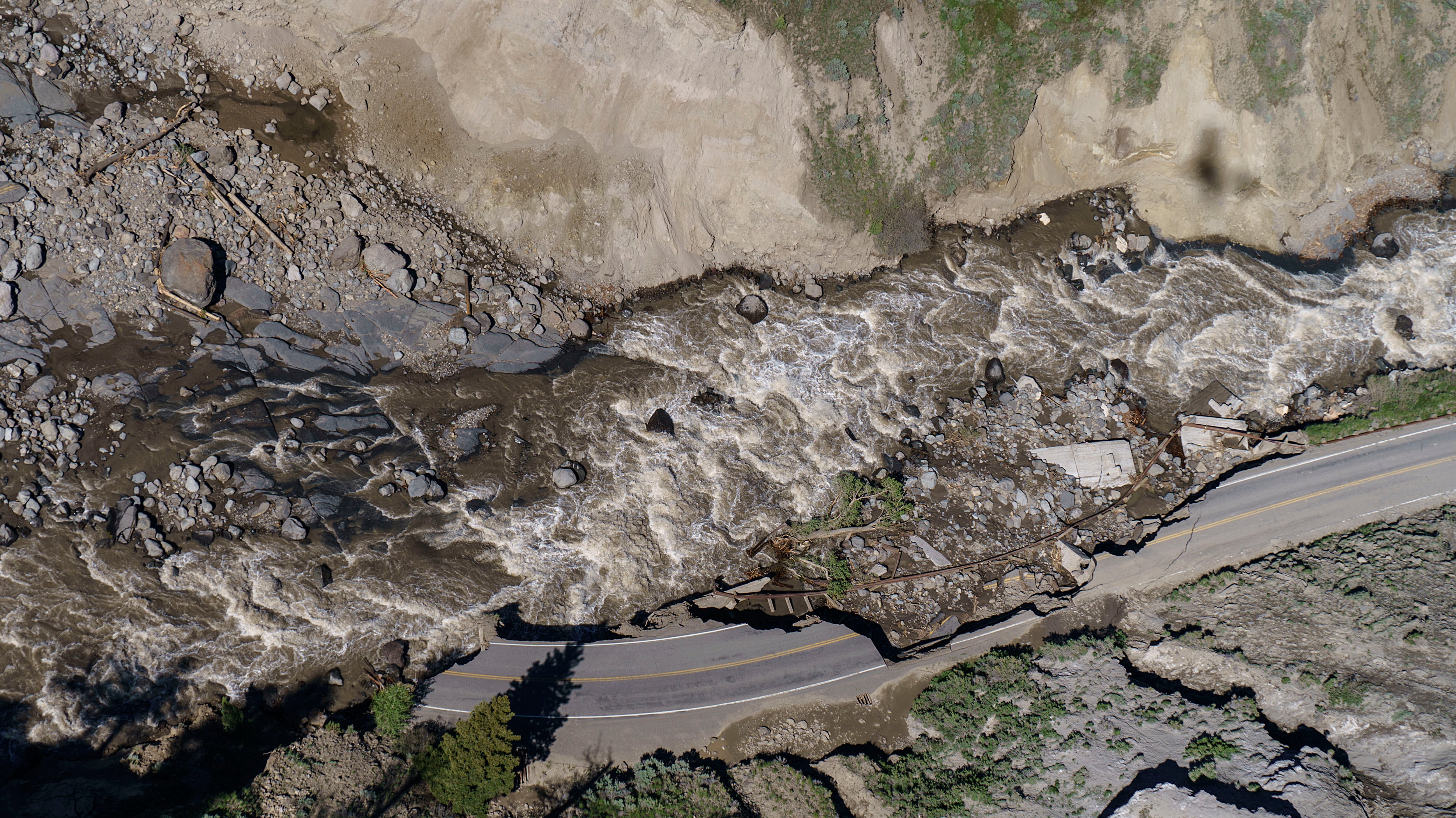 Según lo que han revelado los funcionarios del parque y las imágenes y el vídeo de The Associated Press tomados desde un helicóptero, los mayores daños parecían producirse en las carreteras, sobre todo en la que conecta la entrada norte del parque en Gardiner, Montana, con las oficinas del parque en Mammoth Hot Springs. Grandes secciones de la carretera fueron socavadas y arrastradas por el desbordamiento del río Gardner. Es posible que cientos de puentes peatonales de los senderos hayan sido dañados o destruidos.