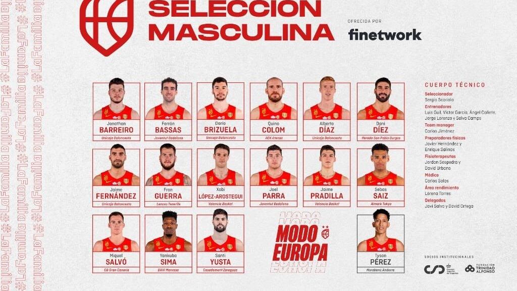Así, la convocatoria la conforman Jonathan Barreiro (Unicaja), Ferran Bassas (Joventut Badalona), Darío Brizuela (Unicaja), Quino Colom (AEK Atenas), Alberto Díaz (Unicaja), Dani Díez (Hereda San Pablo Burgos), Jaime Fernández (Unicaja), Fran Guerra (Lenovo Tenerife), Xabi López Arostegui (Valencia Basket), Joel Parra (Joventut Badalona), Jaime, Pradilla (Valencia Basket), Miquel Salvó (CB Gran Canaria), Sebas Saiz (Almark Tokyo), Yankuba Sima (Baxi Manresa) y Santi Yusta (Casademont Zaragoza). Además, también participará en la concentración, en condición de invitado, Tyson Pérez (Morabank Andorra).