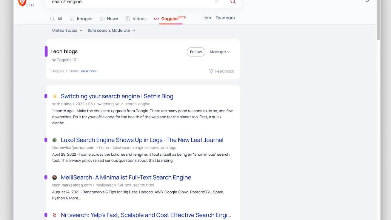 Entre estos 'Goggles', a las que se puede acceder a través de la versión beta, disponible en search.brav.com, destacan una clasificación que prioriza el contenido que se encuentra en los blogs de tecnología.