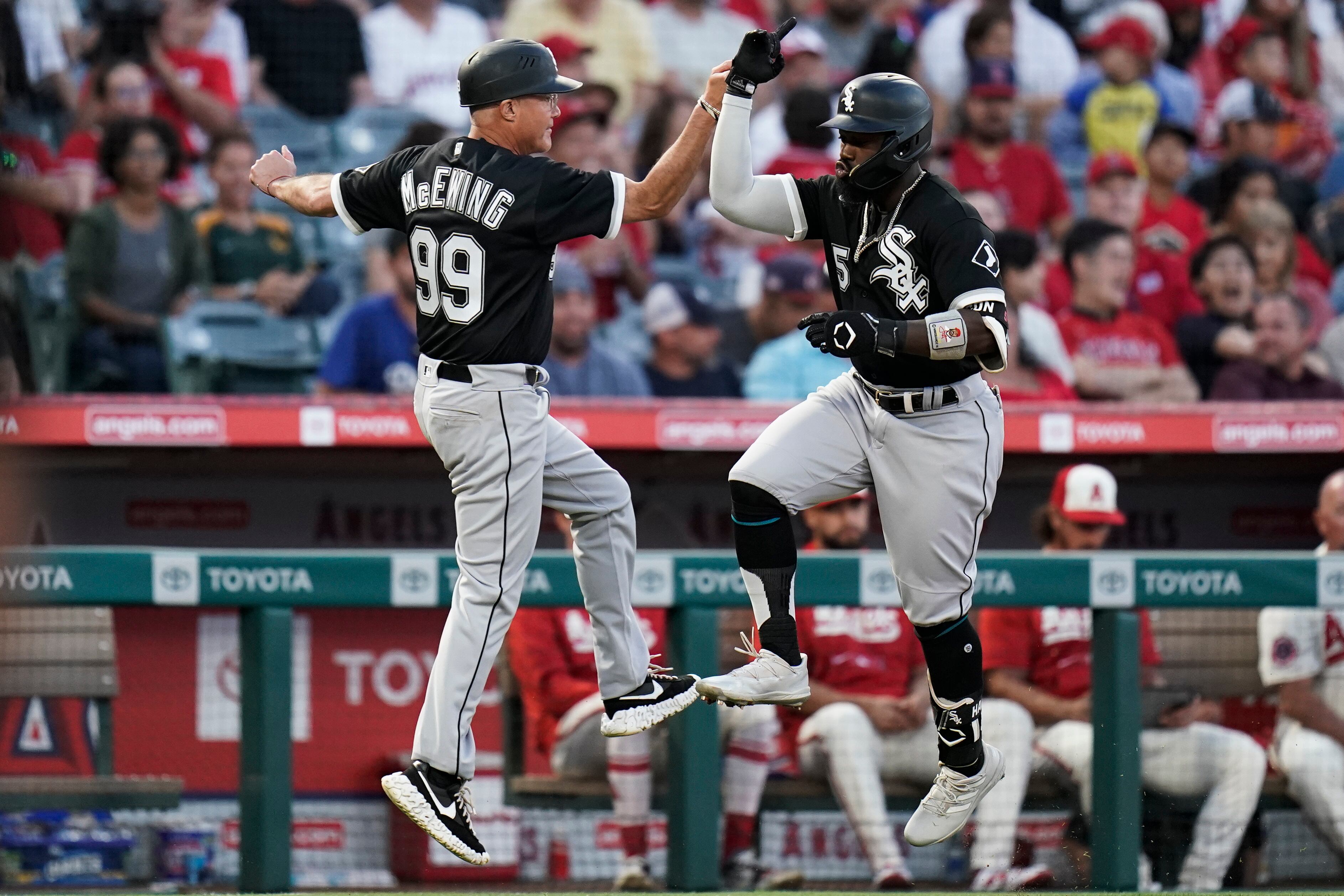 ANAHEIM, California, EE.UU. (AP) — Josh Harrison y Luis Robert sacudieron cuadrangulares en un quinto inning con cinco anotaciones de Chicago y los Medias Blancas batearon 17 hits el martes en su triunfo por 11-4 sobre los Angelinos de Los Ángeles.