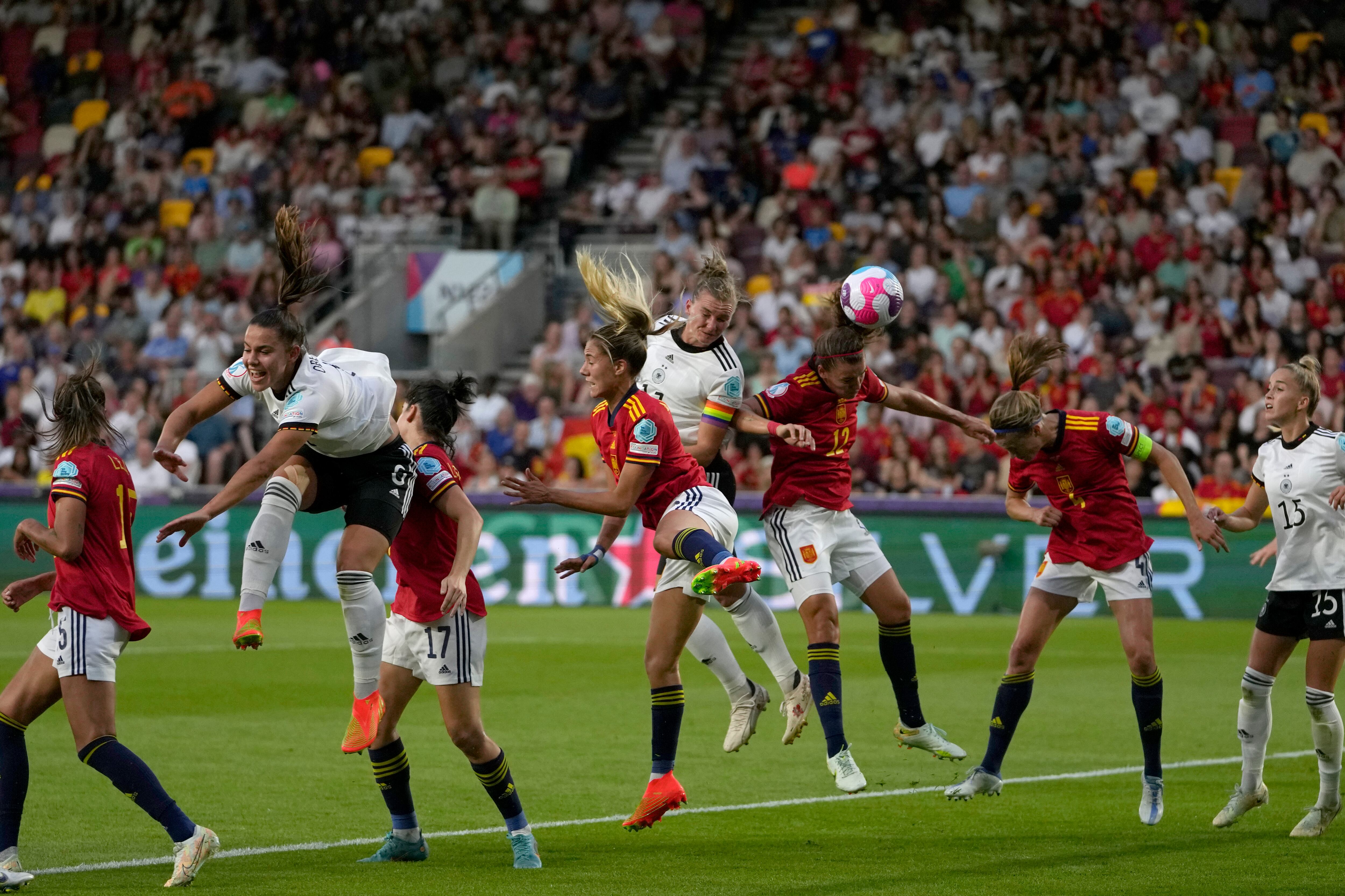 Frente a los 16 mil 37 aficionados en el Estadio de Brentford al Oeste de Londres, las alemanas abrieron el marcador a los tres minutos después de que la guardameta española Sandra Paños intentó despejar el balón en un rutinario pase. Pero el balón le cayó a Bühl, quien superó a Irene Paredes y disparó a la portería.