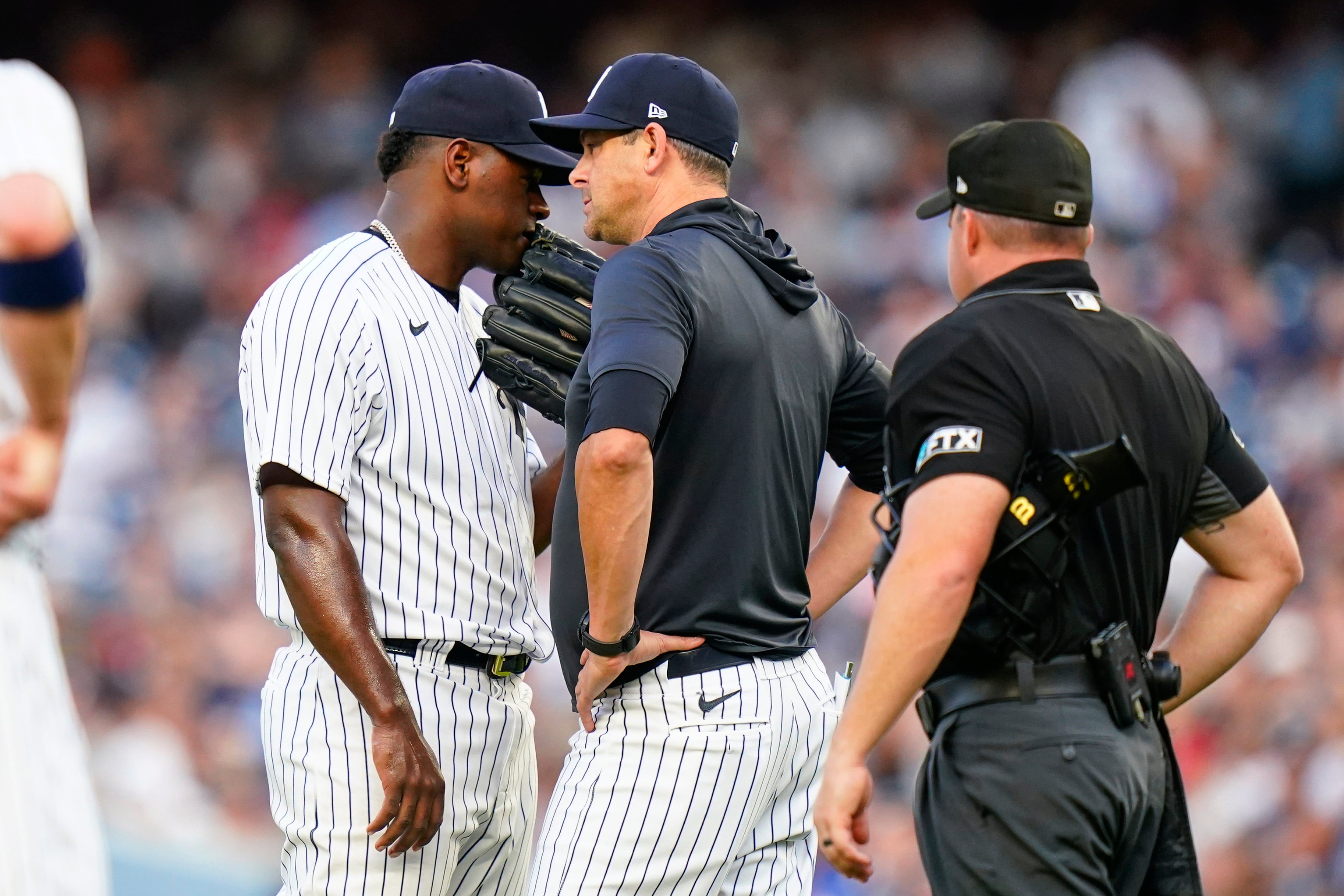 Después de que Boone y un preparador físico se dirigieran al montículo, Severino concluyó el inning. Severino iba a comenzar la tercera entrada y efectuó un lanzamiento de prueba, pero se retiró y fue sustituido por el novato JP Sears, quien fue regresado en opción a la Triple A al término del encuentro.