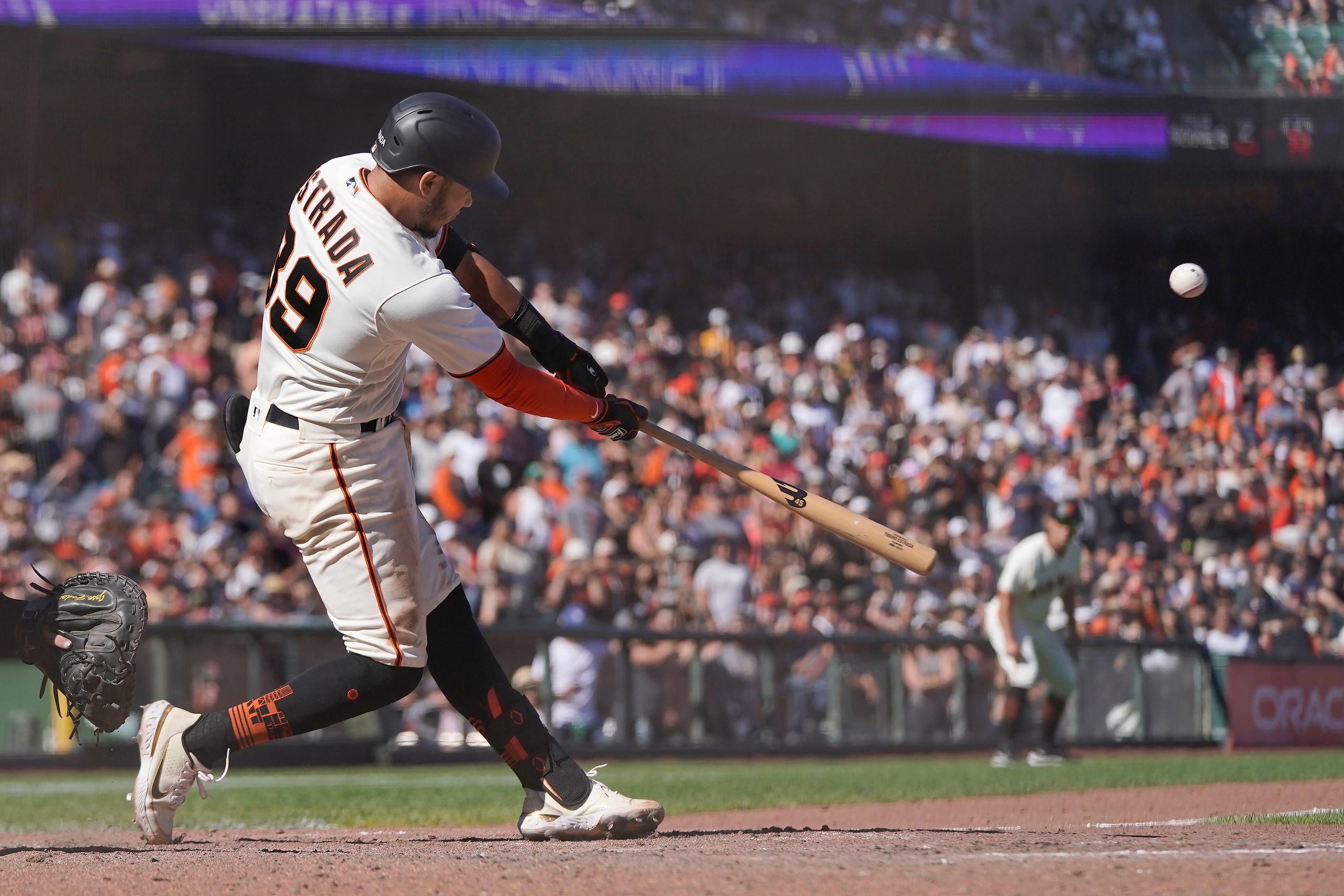 Después que el corredor emergente J.D. Davis fue puesto fuera en segunda base con un roletazo de Mike Yastrzemski, Estrada mandó la pelota al otro lado del muro al fondo entre el jardín izquierdo y central para su 11mo jonrón.