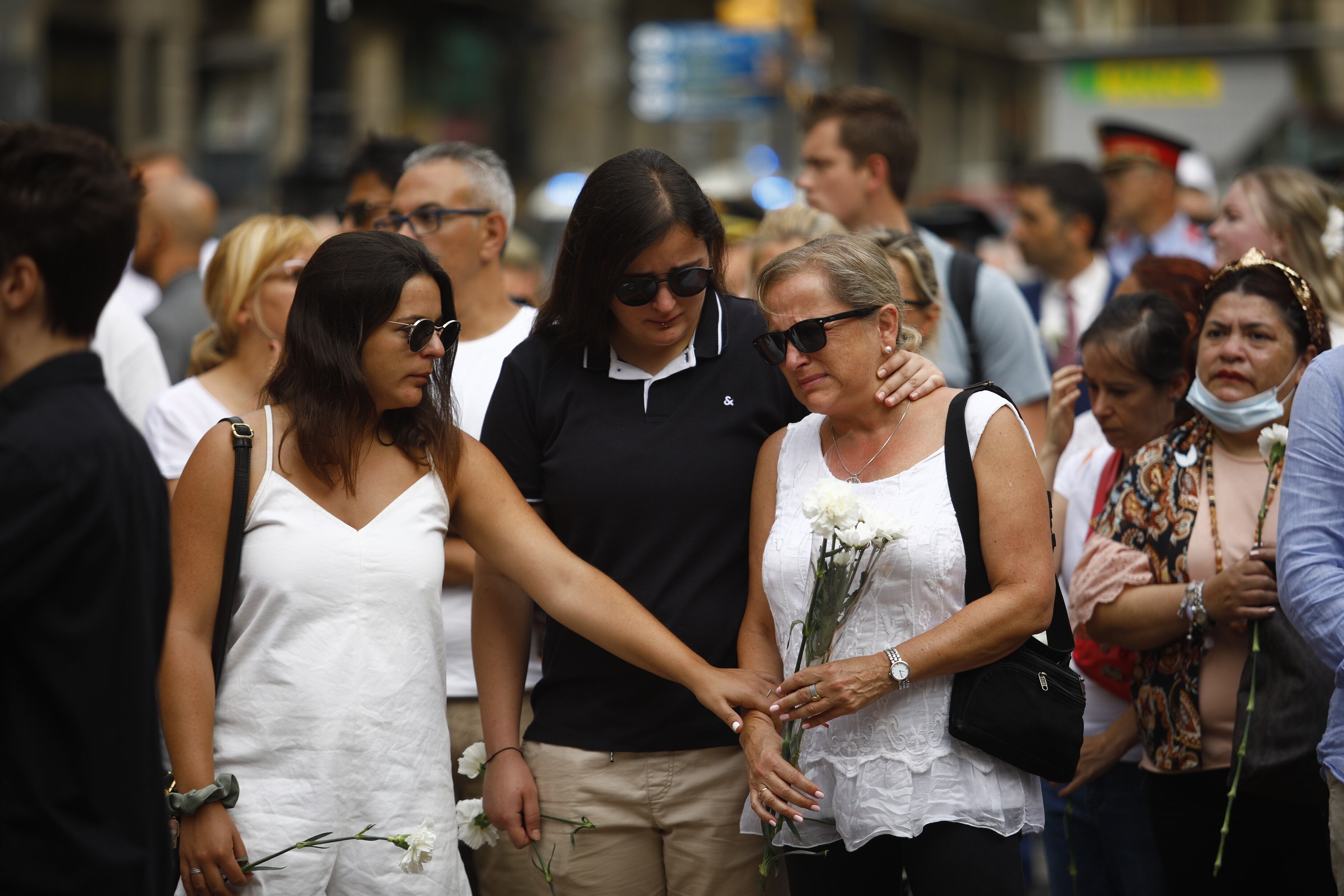 El acto ha finalizado con un minuto de silencio acompañado de la música del 'Cant dels Ocells' y una ofrenda floral, y ha dado protagonismo a las víctimas y familiares, que han sido los primeros en depositar claveles blancos sobre el Pla de l'Os, donde el 17 de agosto se detuvo la furgoneta tras el atropello masivo.