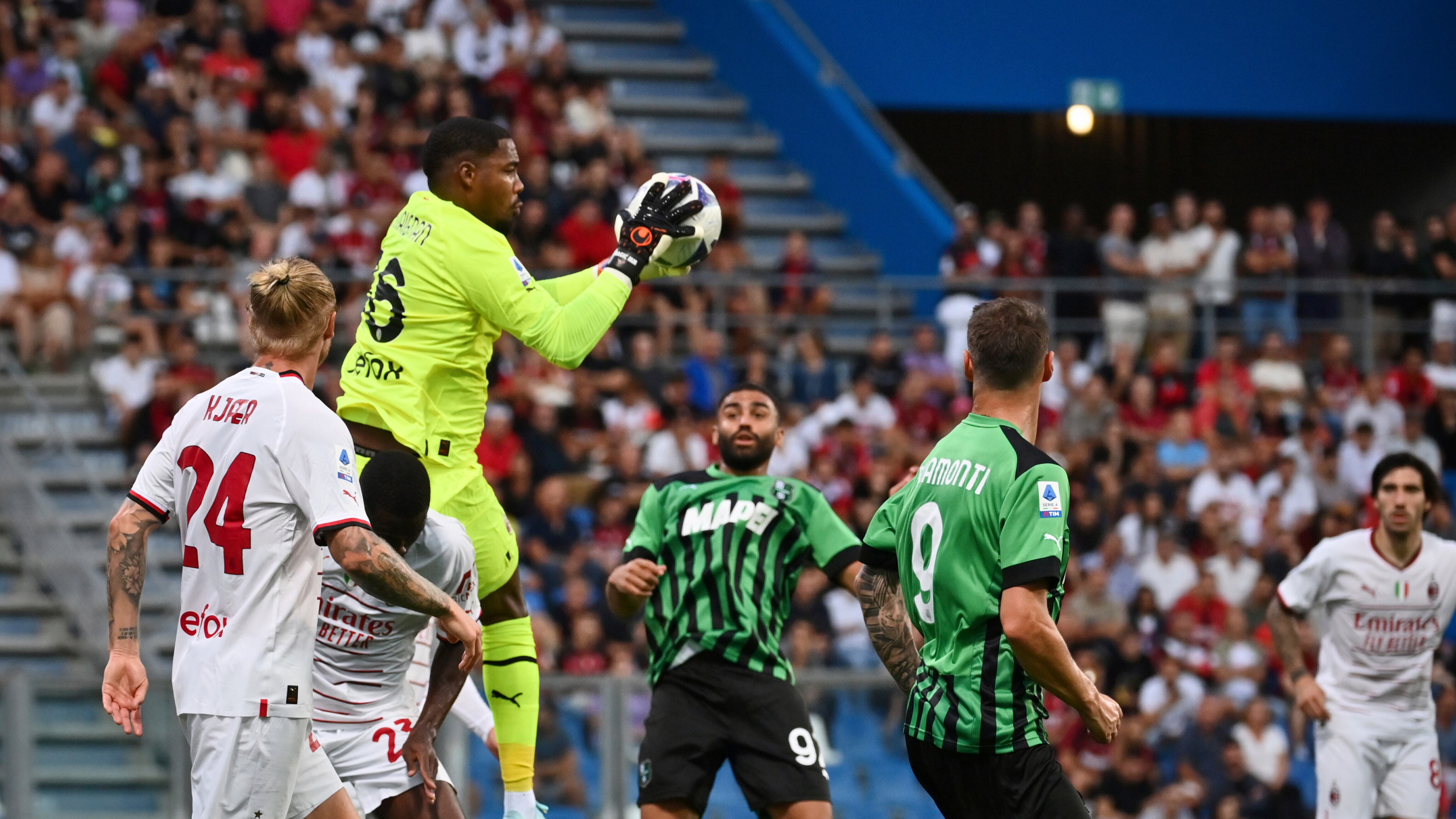Maignan paró un penal mal cobrad por Domenico Berardi en la primera mitad — el 9no penal que ha salvado de os 29 que ha enfrentado desde su arribo a la Serie A e Lille el año pasado.