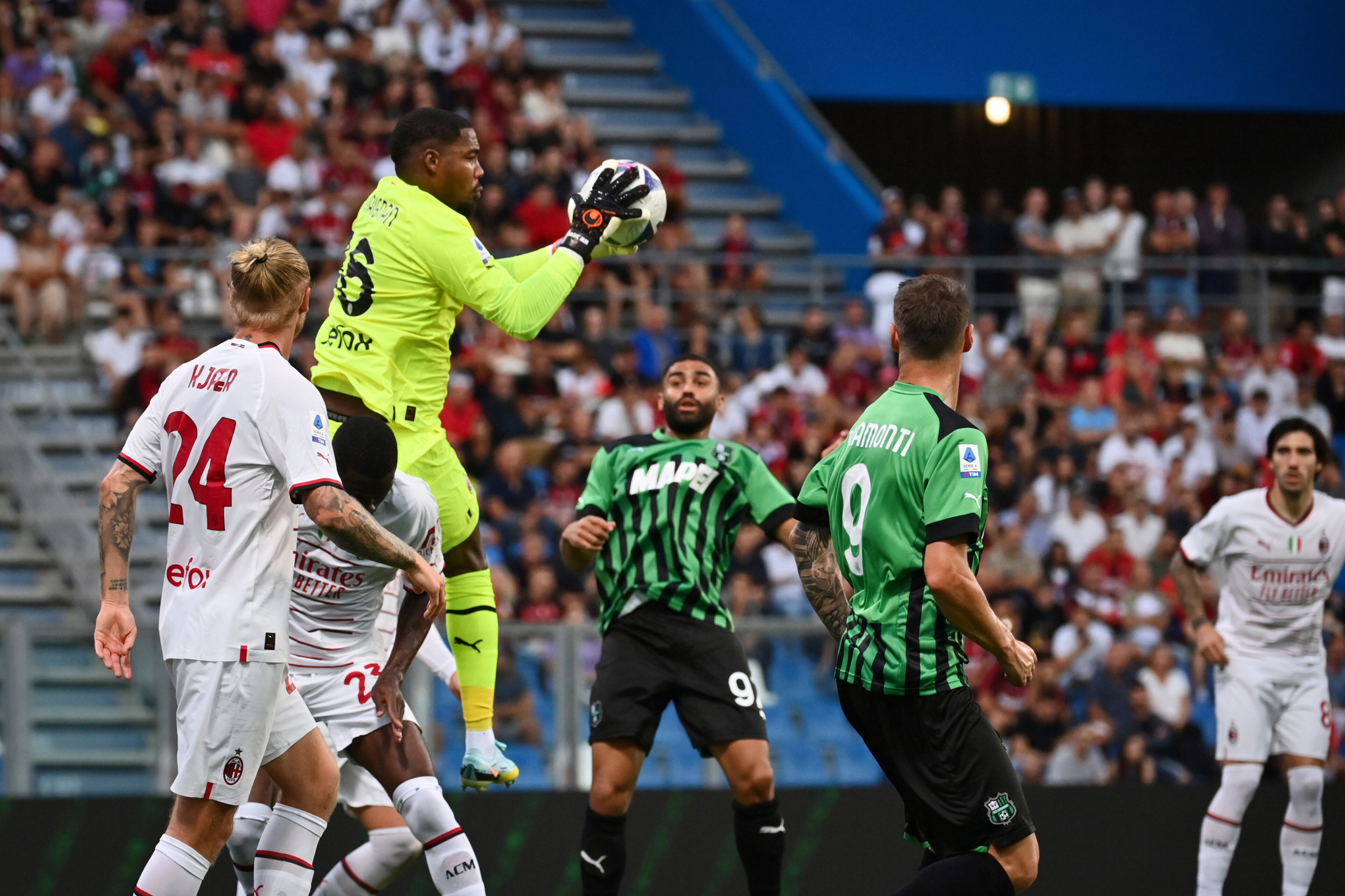 Maignan paró un penal mal cobrad por Domenico Berardi en la primera mitad — el 9no penal que ha salvado de os 29 que ha enfrentado desde su arribo a la Serie A e Lille el año pasado.