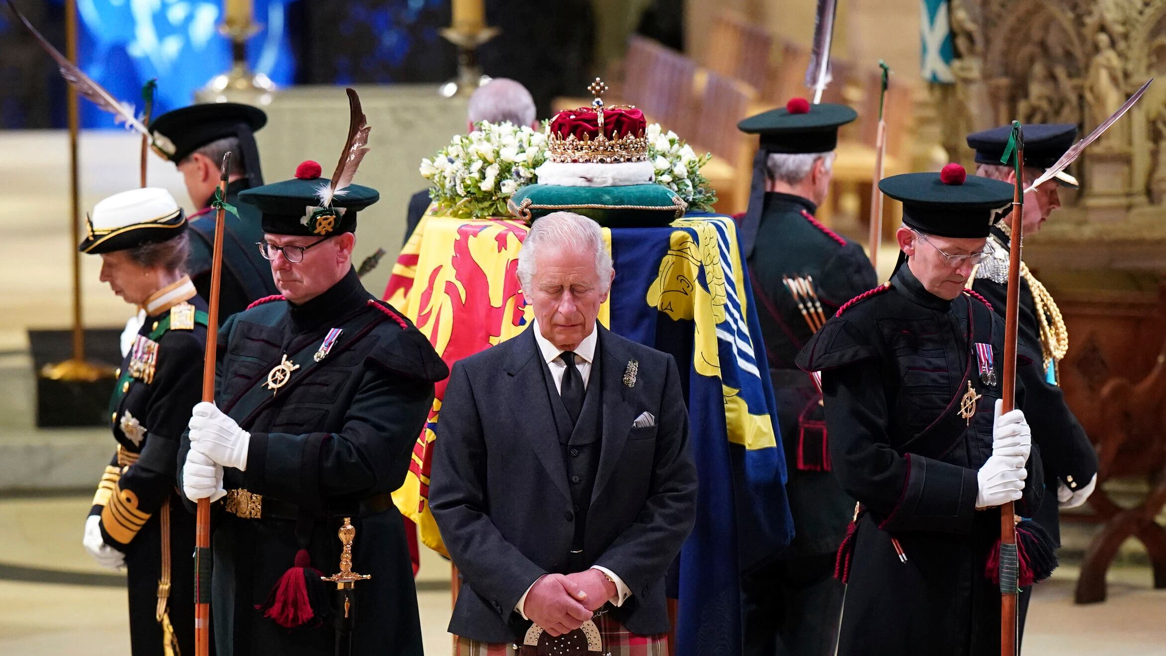 Carlos y sus hermanos, Ana, Andrés y Eduardo, velaron brevemente el ataúd de su madre, cubierto por un estandarte en la Catedral de St. Giles, mientras la gente pasaba al lado.