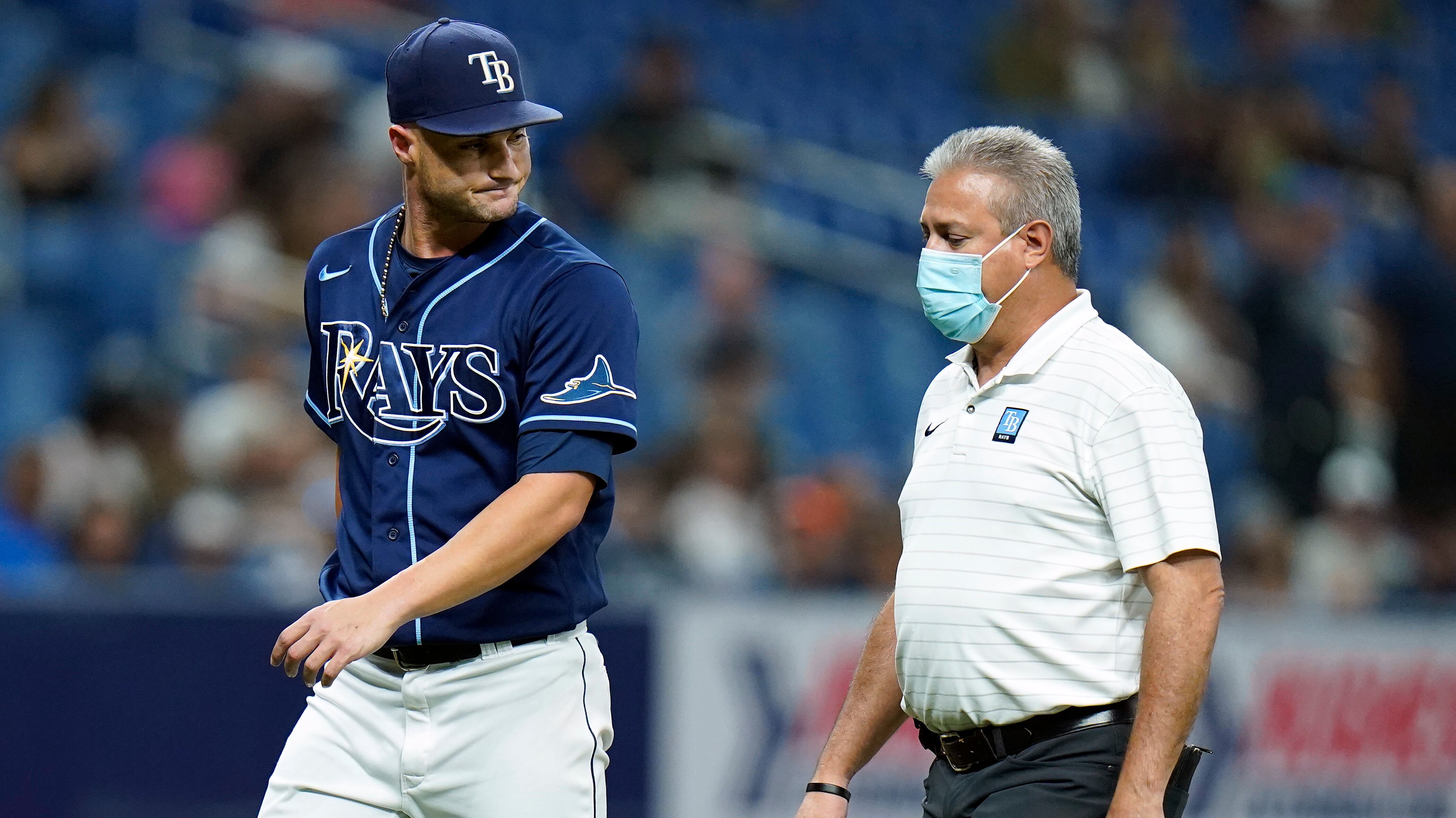 Entregó un boleto al venezolano José Altuve en el inicio del quinto episodio, antes de lanzar tres bolas seguidas al dominicano Jeremy Peña. El manager Kevin Cash y un kinesiólogo llegaron desde la cueva y retiraron al lanzador de 25 años, pese a que pareció decir: “Estoy bien”.