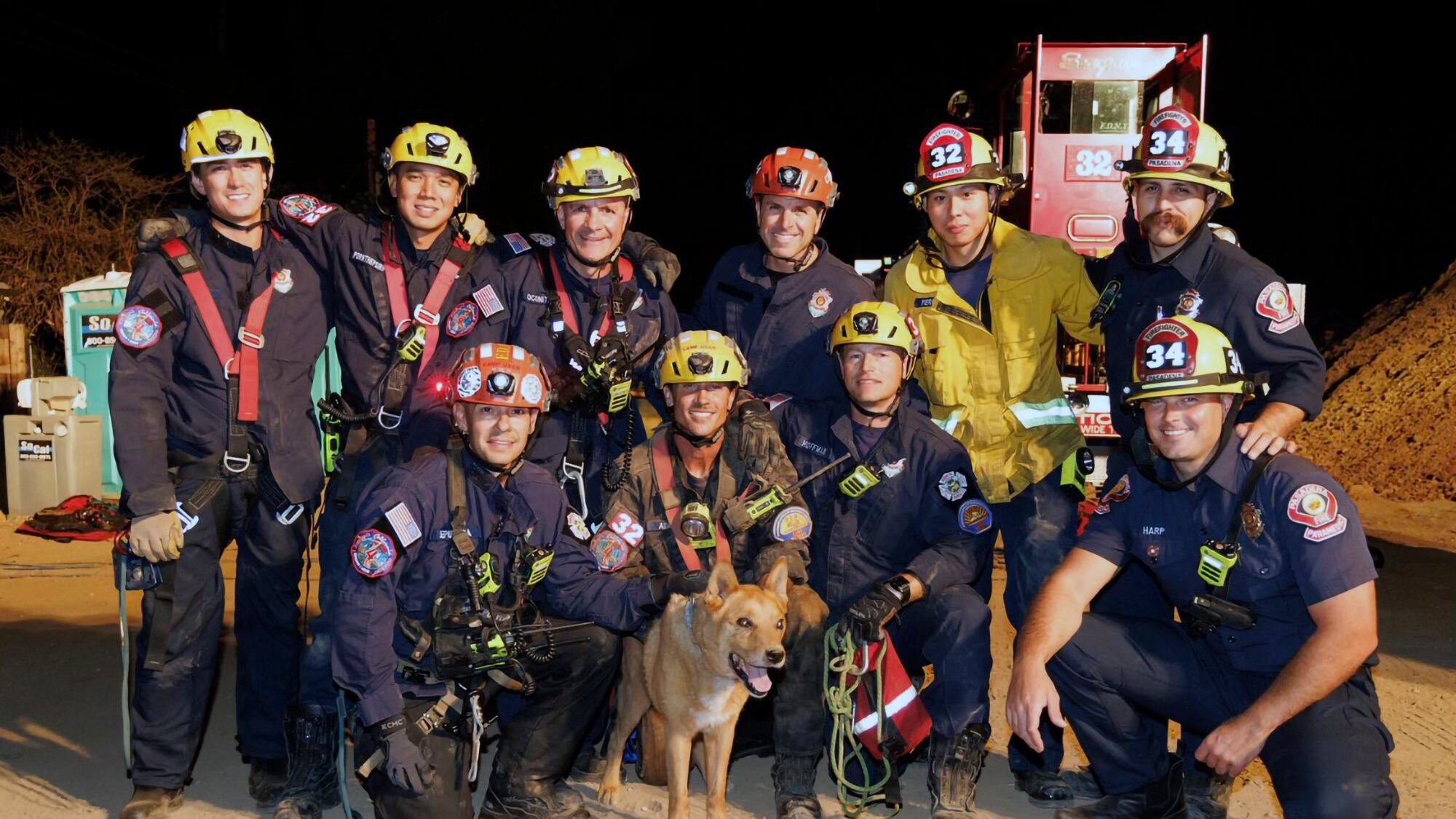 Esta imagen proporcionada por el Departamento de Bomberos de Pasadena muestra a bomberos posando con Cesar, un perro ciego que fue rescatado de un hoyo en Pasadena, California, el 20 de septiembre de 2022. (Departamento de Bomberos de Pasadena vía AP) AP (AP)
