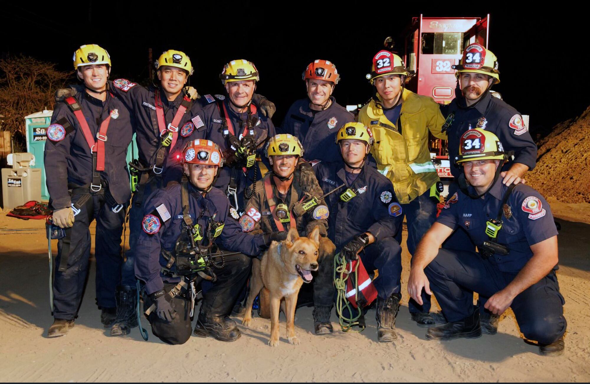Esta imagen proporcionada por el Departamento de Bomberos de Pasadena muestra a bomberos posando con Cesar, un perro ciego que fue rescatado de un hoyo en Pasadena, California, el 20 de septiembre de 2022. (Departamento de Bomberos de Pasadena vía AP) AP (AP)