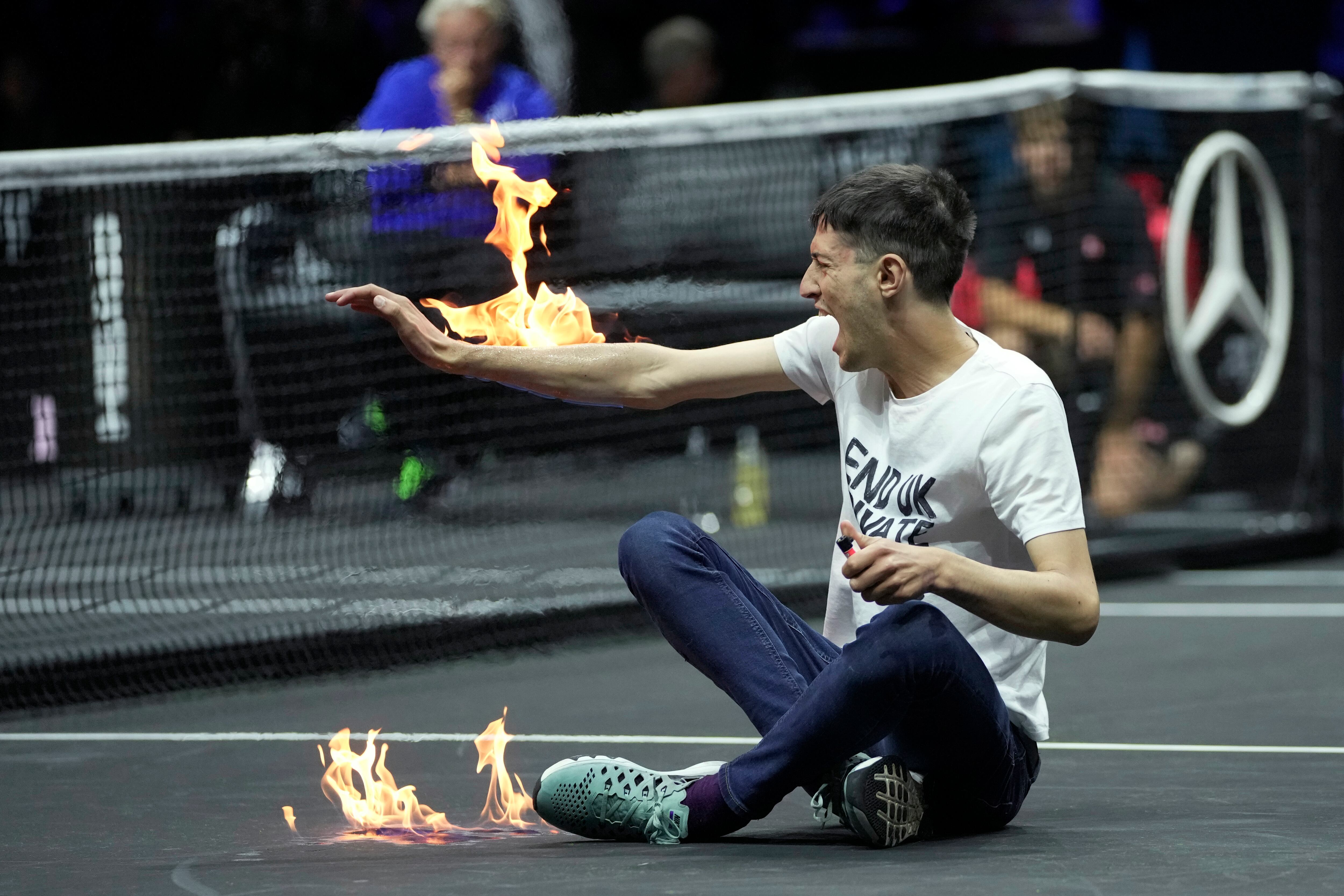 LONDRES (AP) — Un manifestante prendió fuego a una parte de la cancha y en un brazo durante un partido en el evento de tenis Copa Laver el viernes, horas antes de que Roger Federer jugara por última vez antes de retirarse.