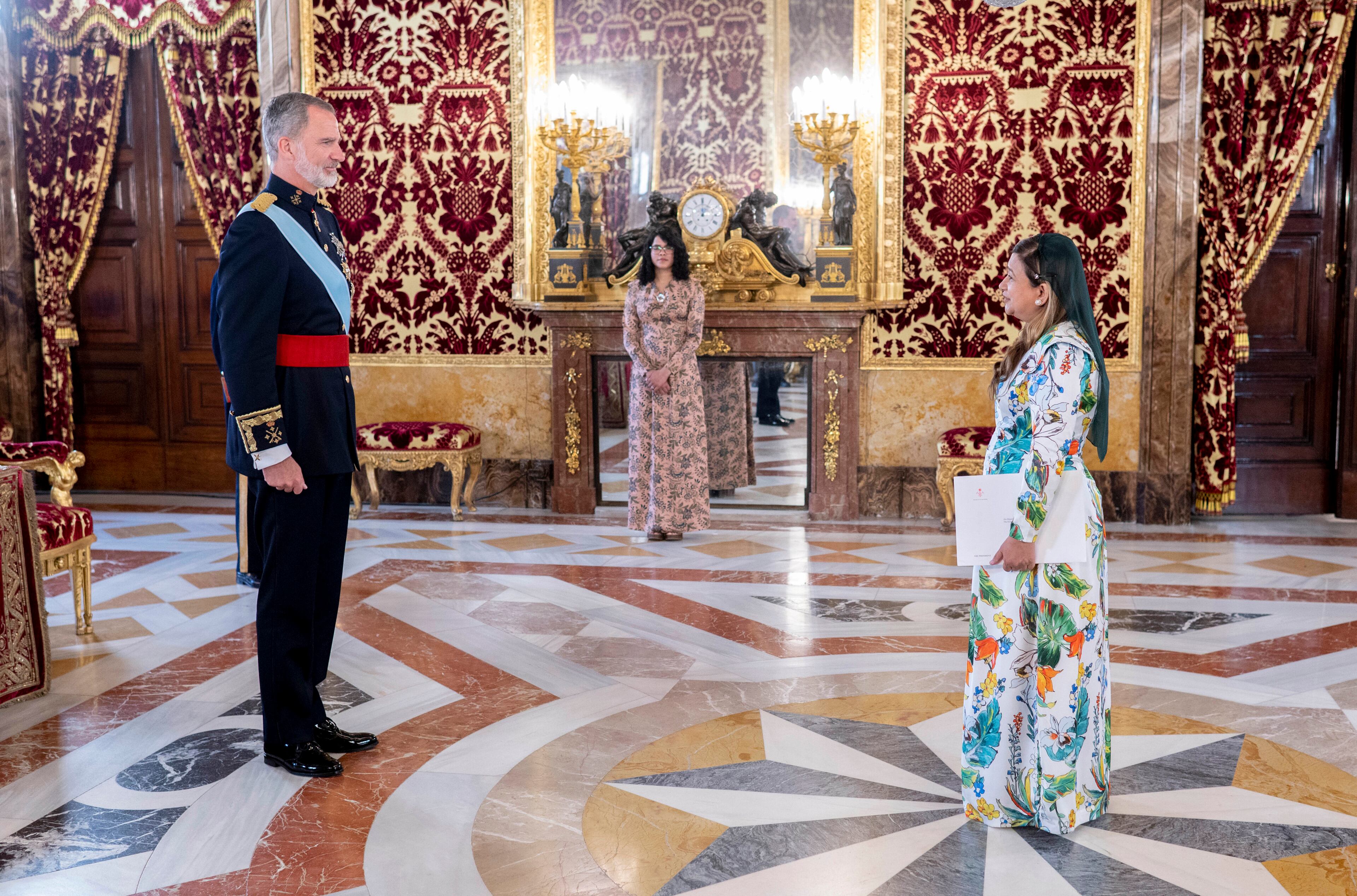 A su llegada al Palacio Real, son recibidos por la banda de música de la Guardia Real en el Patio de la Armería, que interpreta los himnos de sus respectivos países. El Rey, además de recibir los documentos acreditativos, mantiene con todos ellos por separado un breve encuentro.