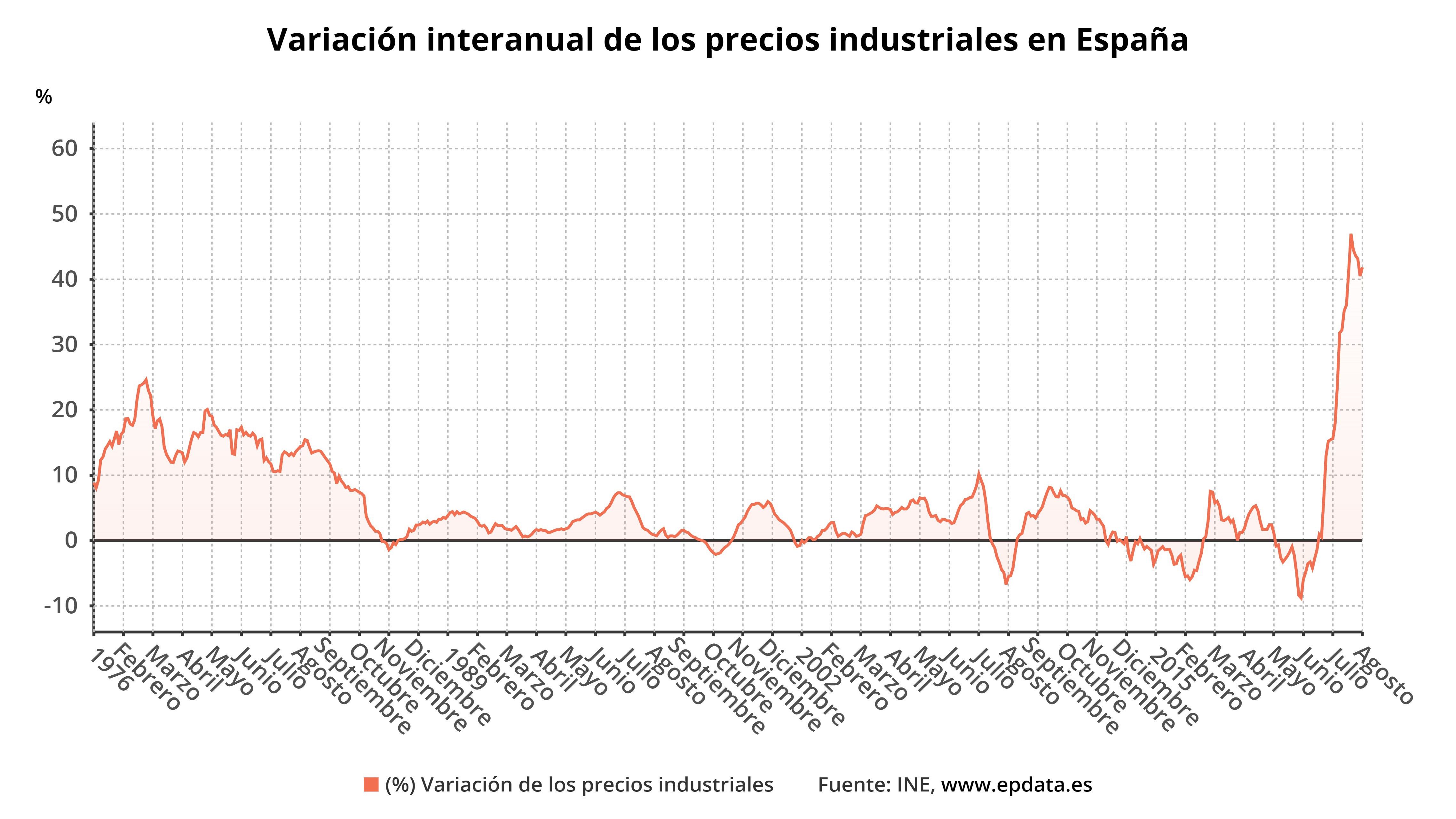 Tras cuatro meses seguidos en los que la tasa interanual se fue moderando mes a mes, los precios industriales han vuelto a coger carrerilla en agosto, pero sin llegar a los máximos alcanzados el pasado mes de marzo, cuando subían a un ritmo del 47%.