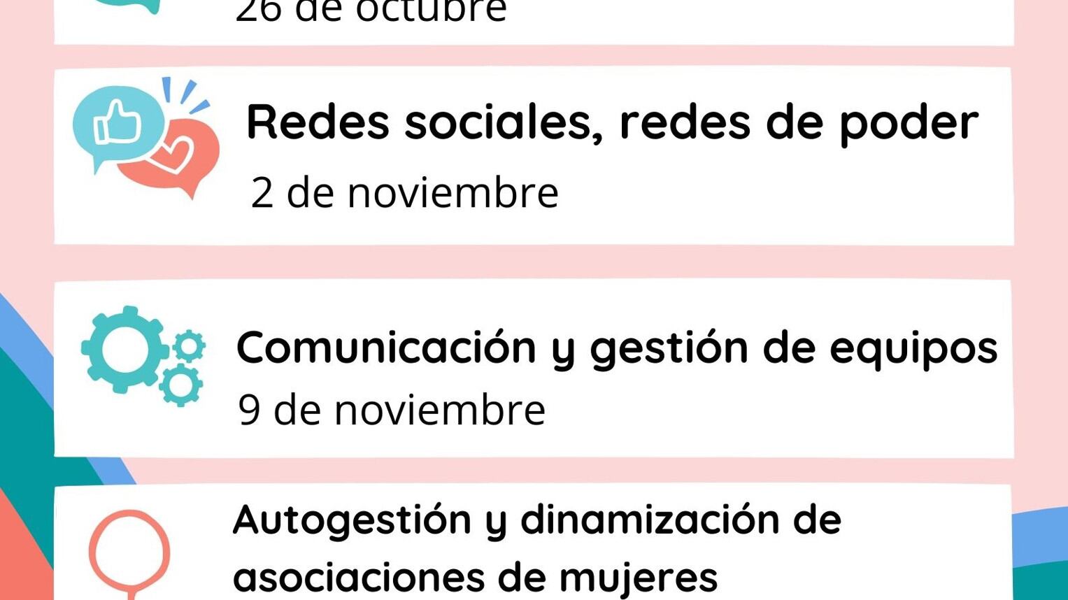 Ya en noviembre, en la jornada del día 2, está prevista la formación en redes sociales y redes de poder, mientras que el 9 de noviembre la protagonista será la comunicación y gestión de equipos.