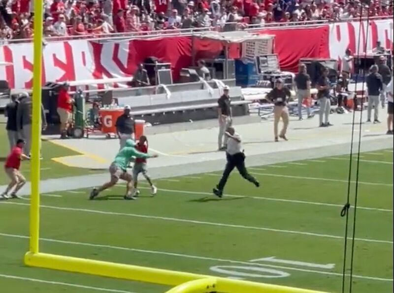 Un niño corrió hacia la cancha y fue derribado de dura forma por un elemento de seguridad en el segundo cuarto del partido entre los Buccaneers de Tampa Bay y los Falcons de Atlanta el domingo.