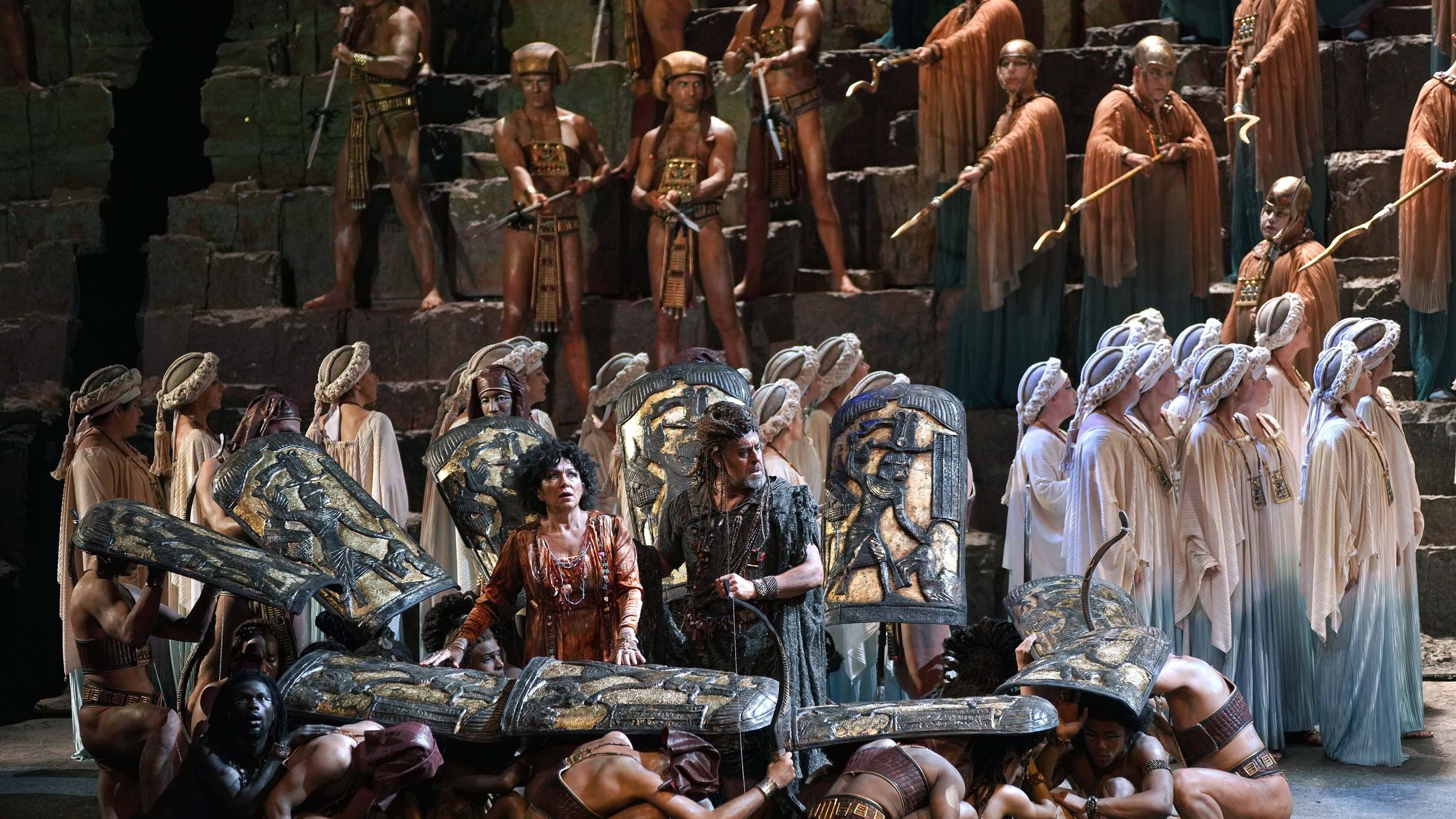 Por el Real han desfilado esta noche actores negros --cabe recordar que 'Aída' está ambientada en el antiguo Egipto y la princesa es etíope--, pero para el resto del reparto se ha renunciado al recurso técnico de pintarse las caras. Sobre el escenario, casi 300 artistas, entre solistas, coro, bailarines, actores y orquesta, con el objetivo de dar a la obra de Verdi "su verdadera dimensión universal".