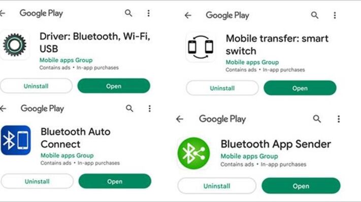 Las aplicaciones identificadas continúan disponibles en Google Play Store, y son: 'Bluetooth Auto Connect' (con más de 1.000.000 de descargas), 'Bluetooth App Sender' (con más de 50.000 descargas), 'Driver' y 'Mobile transfer' (ambas con más 1.000 descargas).