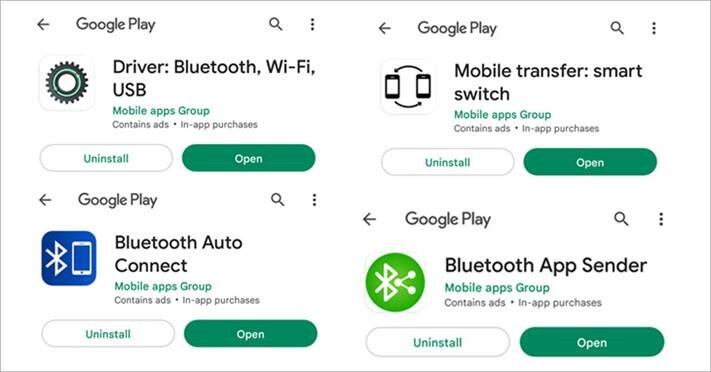 Las aplicaciones identificadas continúan disponibles en Google Play Store, y son: 'Bluetooth Auto Connect' (con más de 1.000.000 de descargas), 'Bluetooth App Sender' (con más de 50.000 descargas), 'Driver' y 'Mobile transfer' (ambas con más 1.000 descargas).