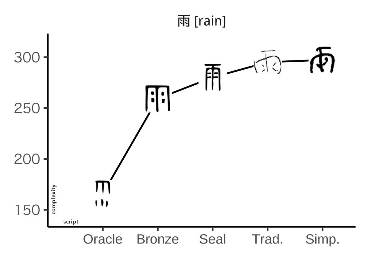 El efecto exactamente opuesto se encuentra en muchos otros sistemas de escritura del mundo. Los primeros inventores de sistemas de escritura a menudo se inspiraron en imágenes detalladas de cosas reales, pero las generaciones posteriores comenzaron a abreviar sus formas de letras a formas más simples. En aras de la eficiencia, los signos escritos tienden a volverse más simples y sistemáticos con el tiempo.