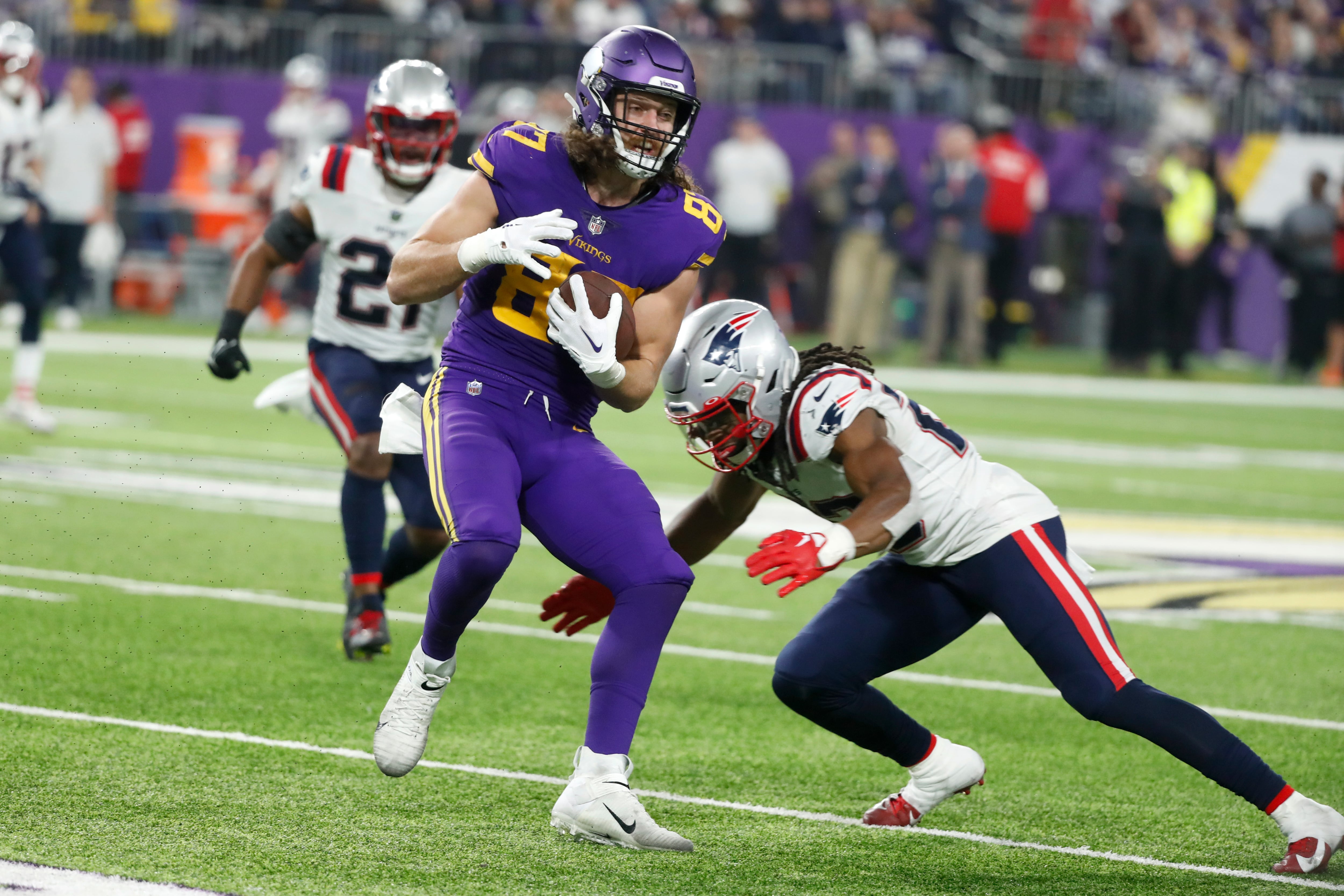 Jones completó con Hunter Henry un pase abierto de 37 yardas para touchdown en la segunda mitad que puso a los Patriots arriba 23-16 al comienzo del tercer periodo. Los Vikings respondieron con una anotación de Kene Nwangwu en una devolución a una patada de 97 yardas.