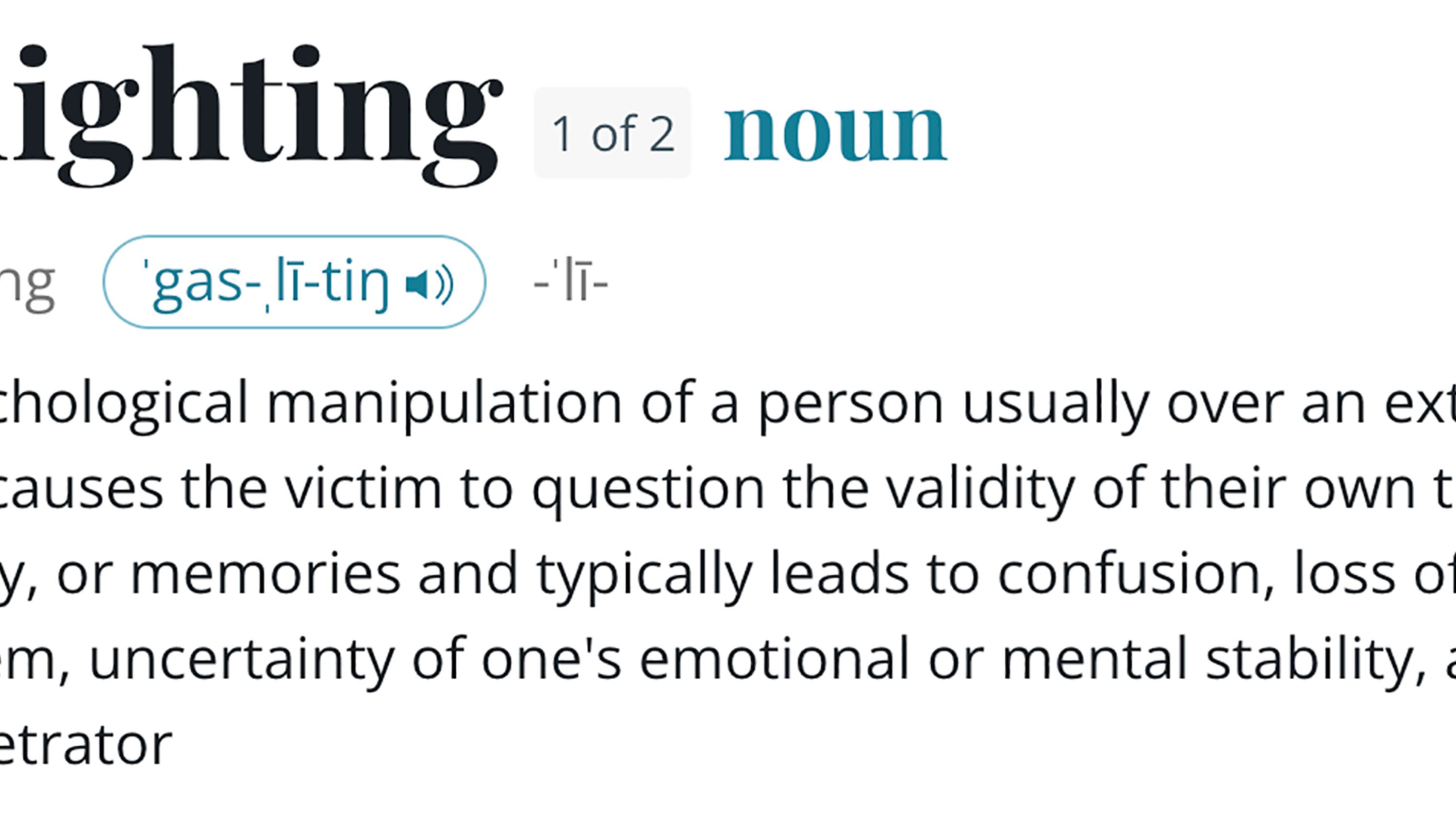 La definición principal de gaslighting de Merriam-Webster es la manipulación psicológica de una persona, generalmente durante un largo período de tiempo, que “causa que la víctima cuestione la validez de sus propios pensamientos, percepción de la realidad o recuerdos y generalmente lleva a la confusión, pérdida de confianza y de autoestima, incertidumbre sobre la estabilidad emocional o mental de uno mismo, y una dependencia al perpetrador”.
