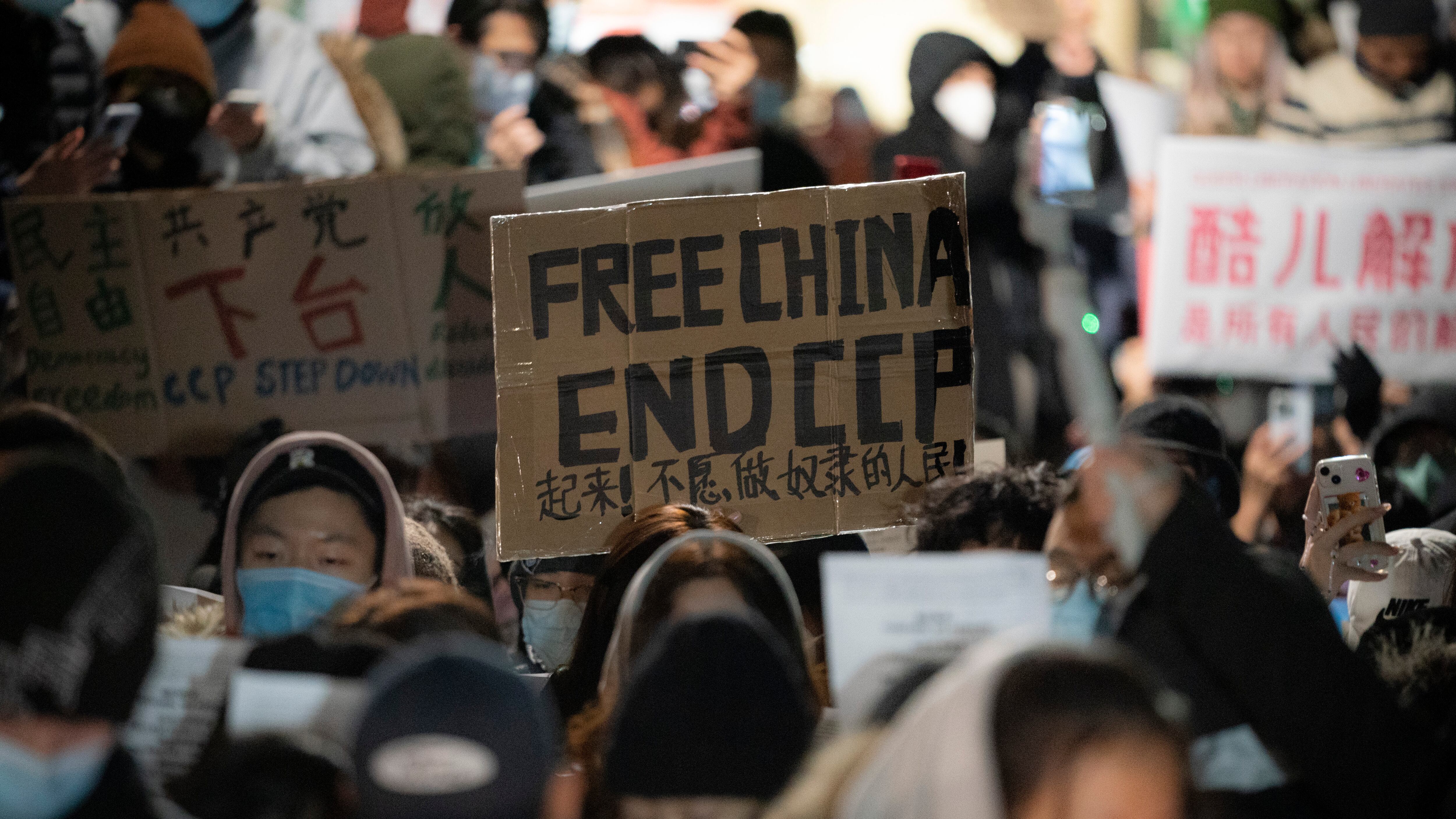 En Nueva York, alrededor de 400 personas se reunieron del otro lado de la calle frente al consulado, portando pancartas con leyendas como “Dignidad y Libertad a los Ciudadanos” y “China Libre”.
