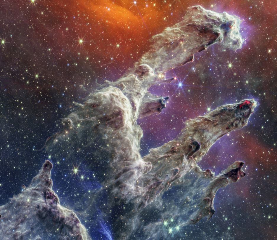 Miríadas de estrellas se extienden por toda la escena. Las estrellas aparecen principalmente en luz infrarroja cercana, lo que marca una contribución de la cámara de infrarrojo cercano de Webb (NIRCam). La luz del infrarrojo cercano también revela miles de estrellas recién formadas: esferas de color naranja brillante que se encuentran justo fuera de los pilares polvorientos.