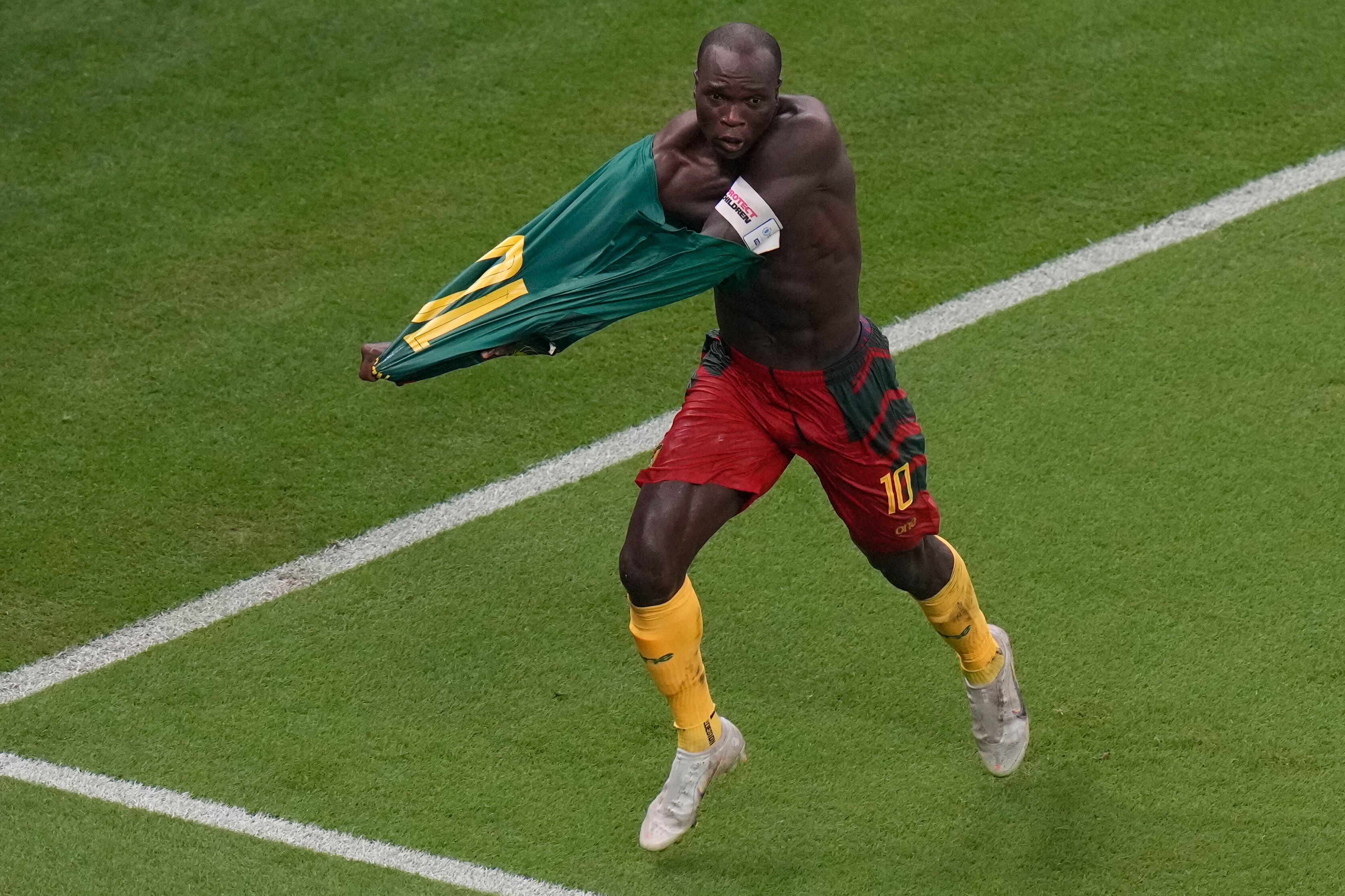 Vincent Aboubakar celebra tras anotar el gol de Camerún en la victoria 1-0 ante Brasil en el partido por el Grupo G del Mundial, el viernes 2 de diciembre de 2022, en Lusail, Qatar. (AP Foto/Alessandra Tarantino) AP (Alessandra Tarantino/AP)