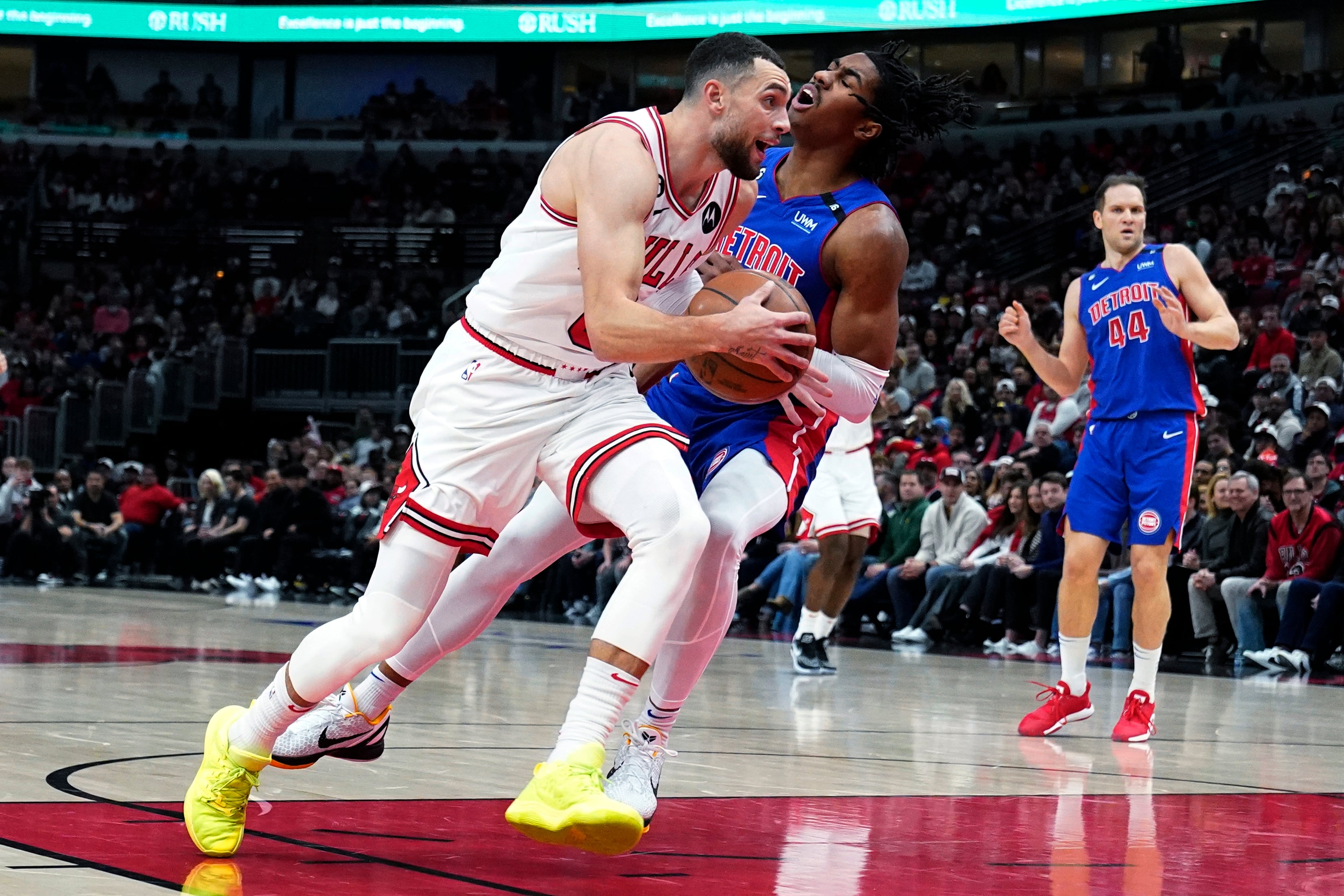LaVine fue ovacionado por los fanáticos cuando coronó un primer cuarto de 18 puntos con una espectacular volcada en la que atrapó en el aire un pase elevado de Coby White y pegara un grito justo antes de que sonara el timbre. También estuvo certero desde la periferia, atinando 5 de 9 intentos de triple y 15 de 20 lanzamientos en el partido.