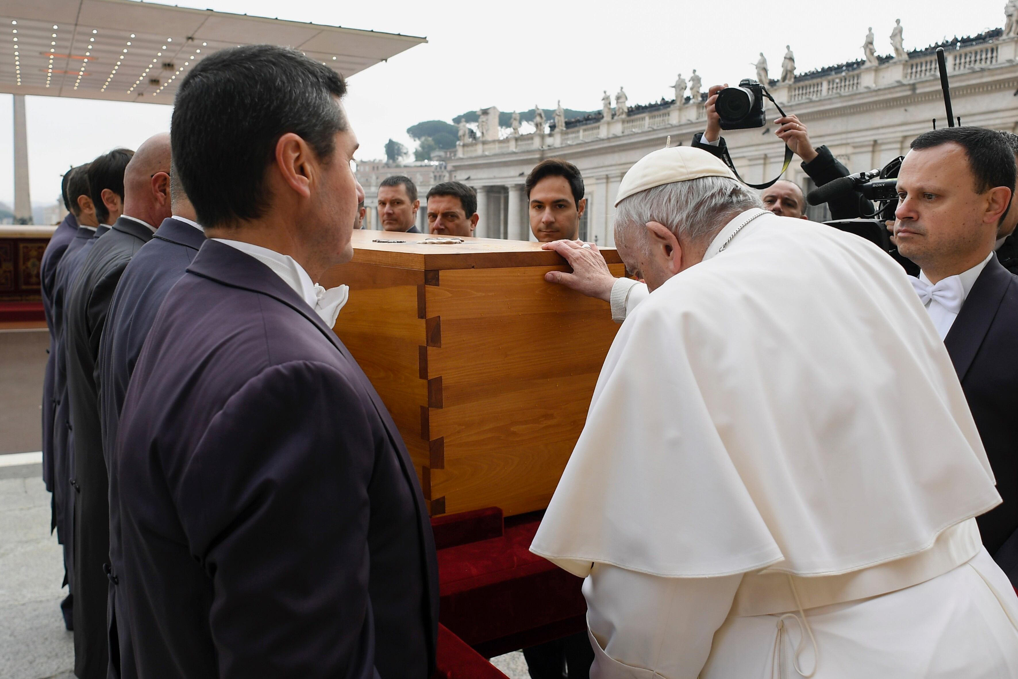 Un grupo de doce sediarios, los antiguos portadores de la Silla Gestatoria de los Papas, han trasladado a hombros a las 08.50 horas el féretro de Benedicto XVI hasta el altar predispuesto en la plaza de San Pedro. El secretario personal del papa emérito, Georg Ganswein y el maestro de ceremonias Litúrgicas Pontificias, Diego Giovanni Ravelli, han colocado el evangelio encima del féretro mientras los fieles rezaban el rosario.