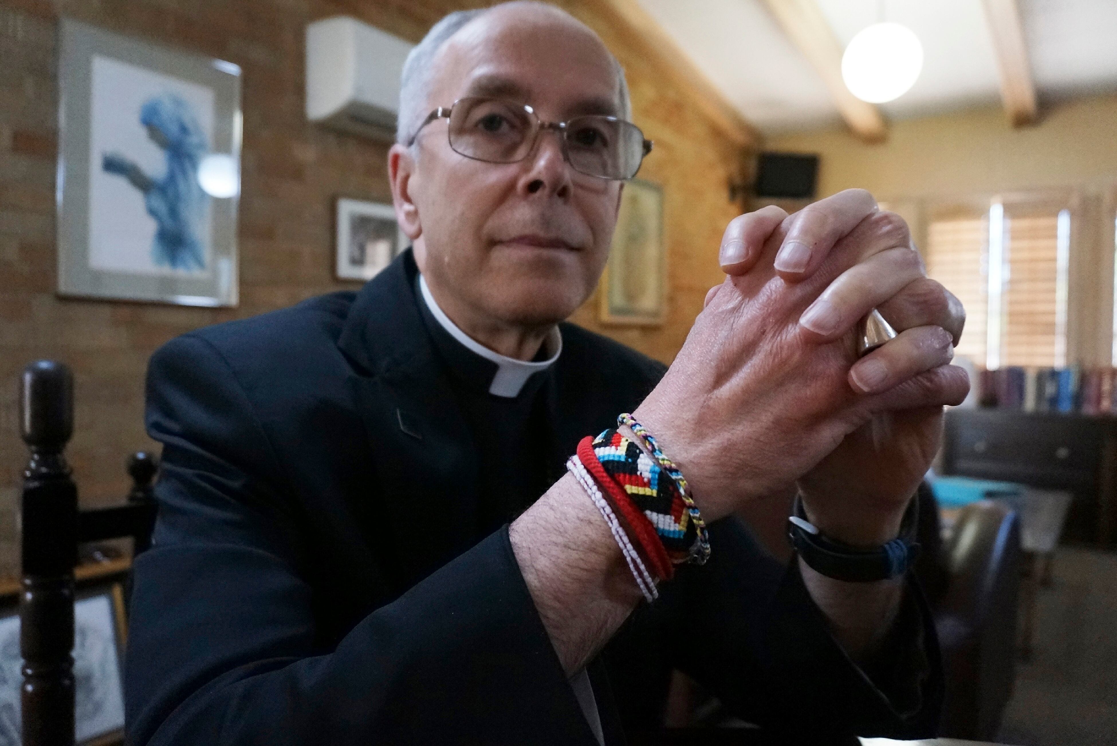 Su ministerio se extiende más allá de los albergues. Durante más de un año ha estado celebrando misa en un refugio federal para migrantes menores de edad que viajan solos, y porta en su muñeca derecha brazaletes de amistad tejidos por algunos de ellos.