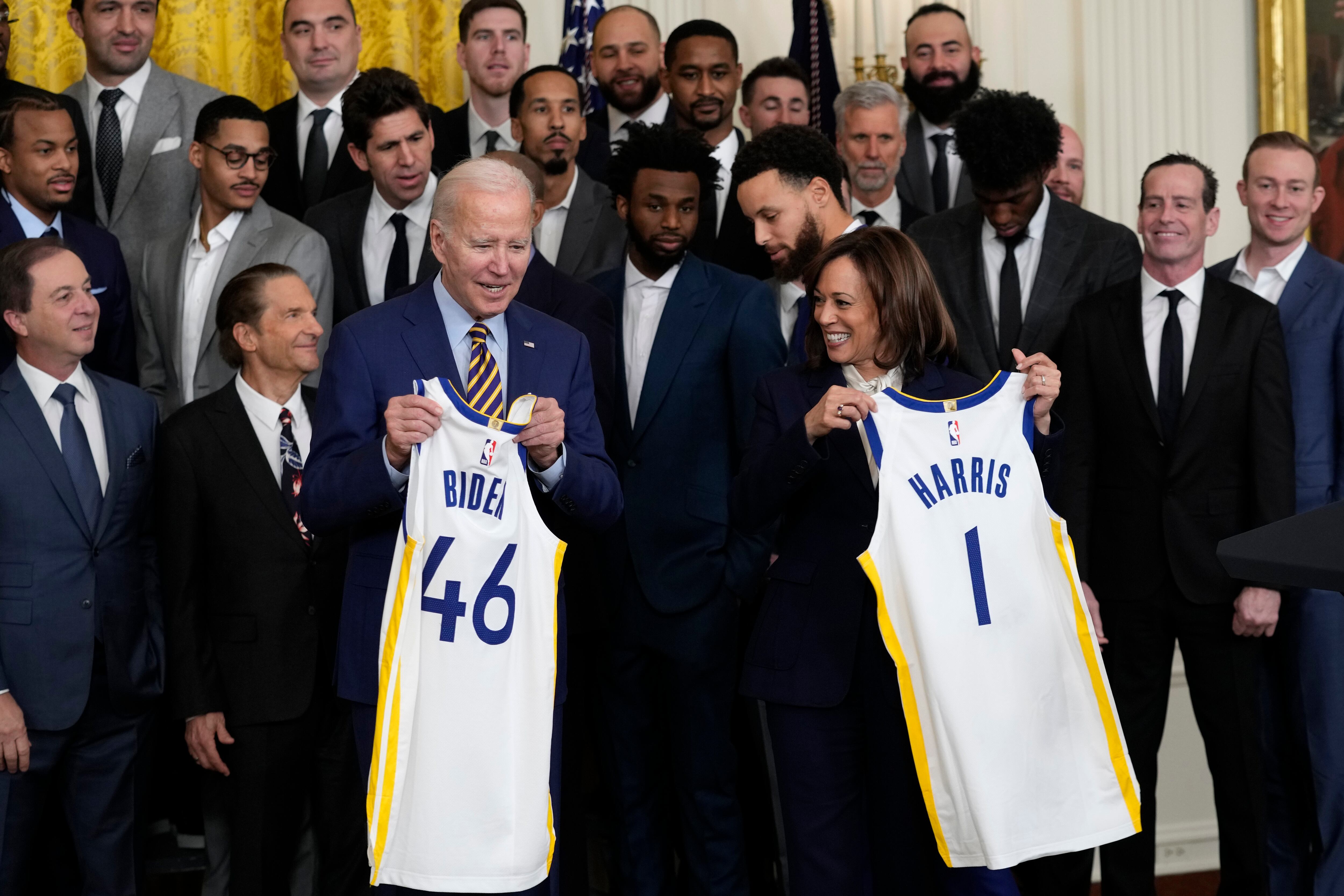 La vicepresidenta Kamala Harris, originaria de California y aficionada de los Warriors, habló primero en la ceremonia del martes.