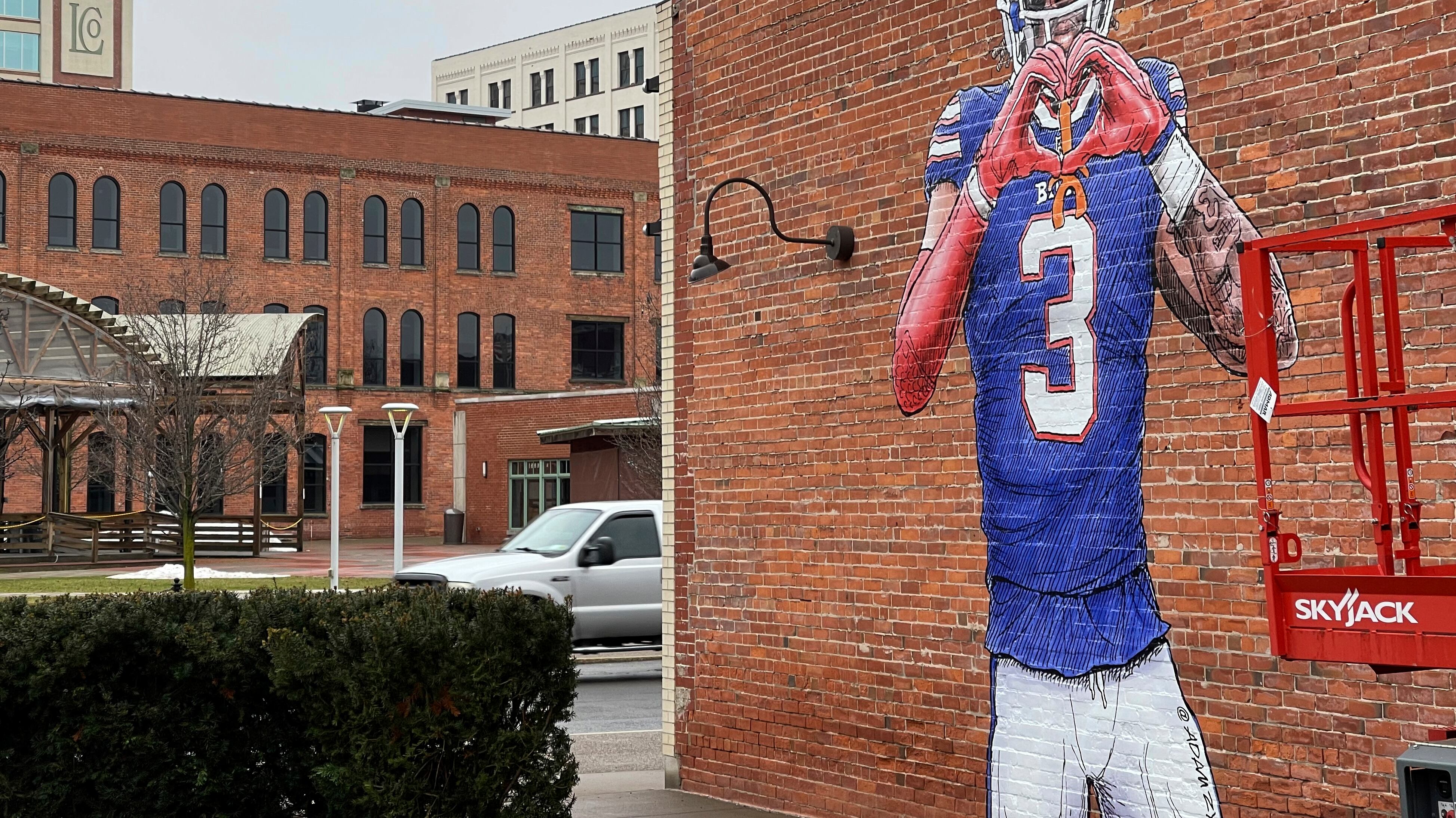 Un mural del artista Adam Zyglis del jugador de los Bills de Buffalo, Damar Hamlin, quien se esta recuperando tras sufrir un paro cardiaco durante un partido el 2 de enero, en la parte exterior de un edificio en Buffalo, Nueva York, el miércoles 18 de en AP (Carolyn Thompson/AP)