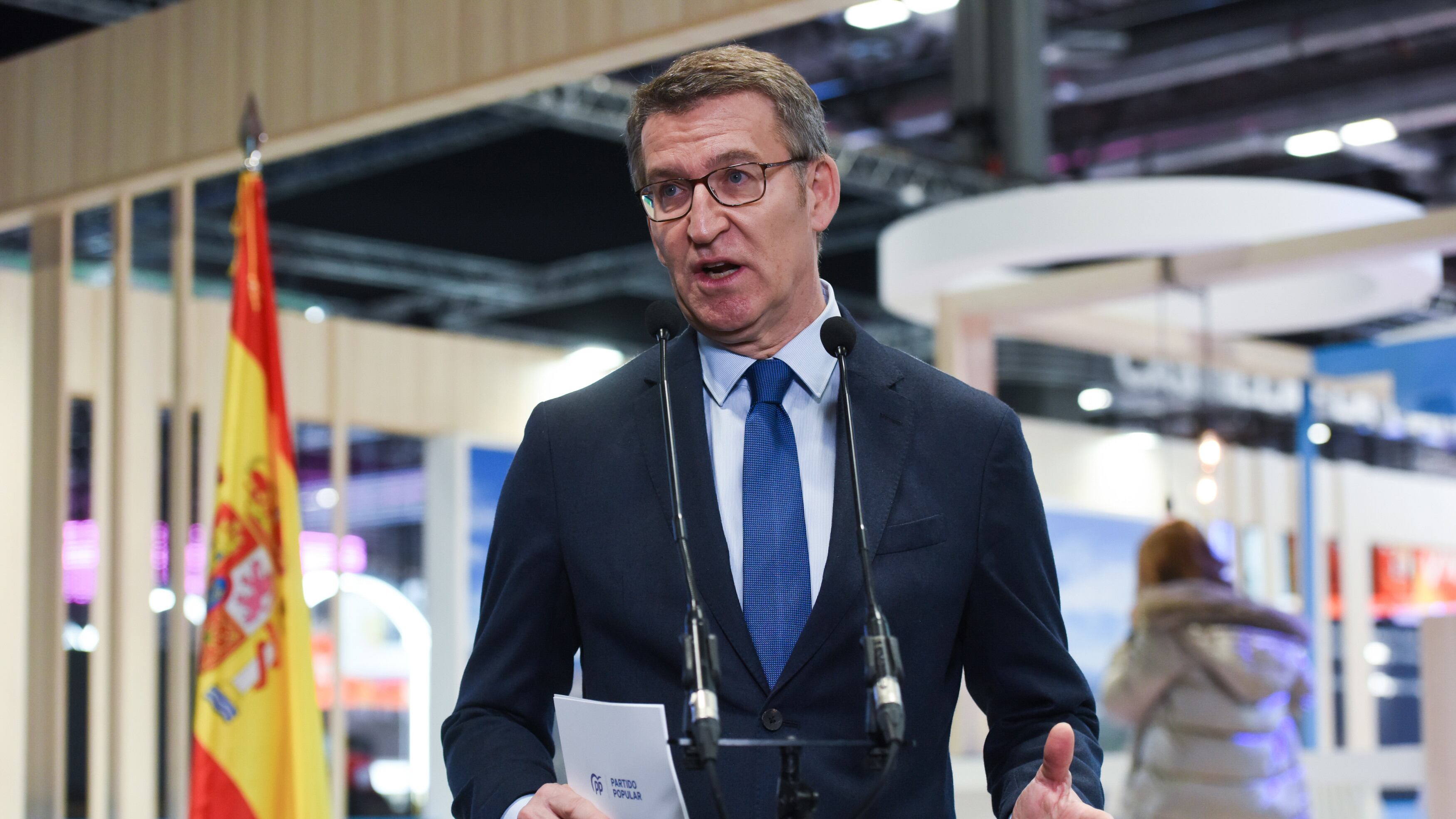 El líder del PP, Alberto Núñez Feijóo, interviene durante una visita a la tercera jornada de la Feria Internacional de Turismo, Fitur 2023, en IFEMA Madrid, a 20 de enero de 2023, en Madrid (España). Alberto Núñez Feijóo, ha visitado hoy la Feria Gustavo Valiente - Europa Press (Gustavo Valiente - Europa Press/Europa Press)