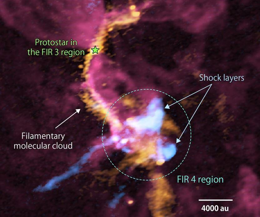Las observaciones del equipo muestran un flujo de salida emitido por una estrella recién formada en una región conocida como FIR 3 que impacta en la cercana región FIR 4, donde está naciendo un grupo de estrellas jóvenes dentro del mismo cúmulo, y crea capas de choque.