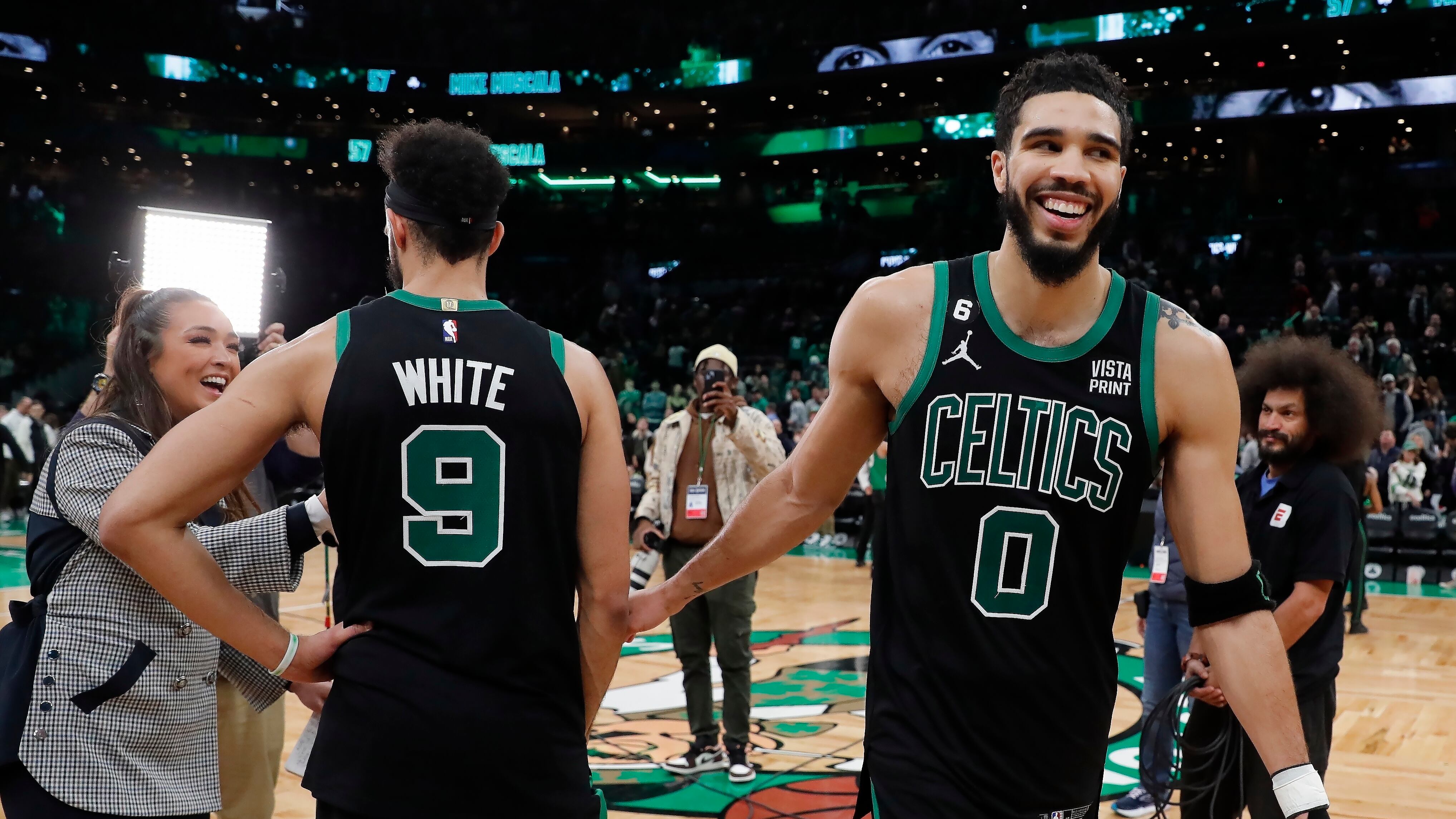 Jayson Tatum (0), de los Celtics de Toston, sonríe junto a Derrick White, tras la victoria sobre los Hornets de Charlotte, el viernes 10 de febrero de 2023 (AP Foto/Michael Dwyer) AP (Michael Dwyer/AP)