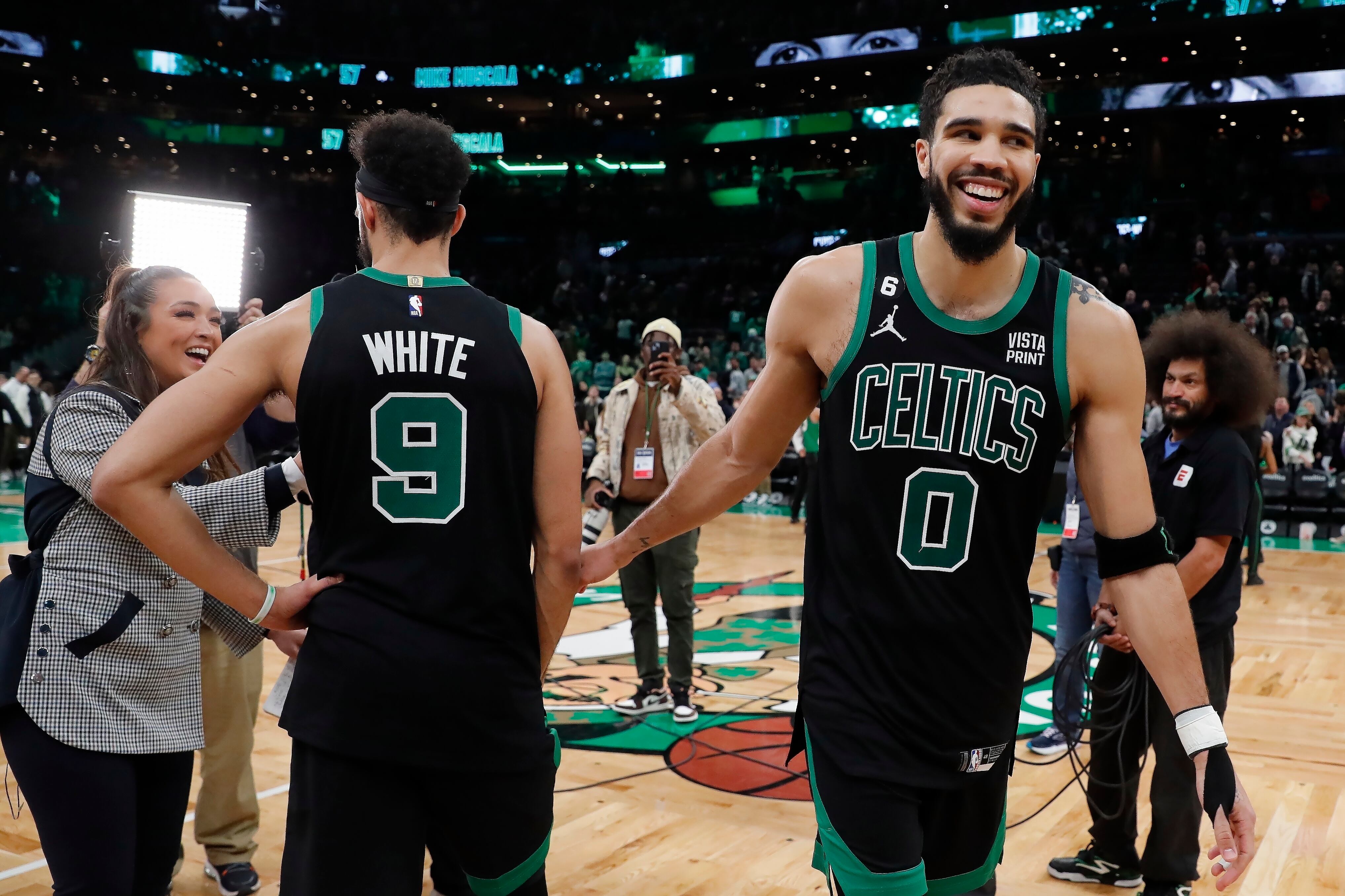 Jayson Tatum (0), de los Celtics de Toston, sonríe junto a Derrick White, tras la victoria sobre los Hornets de Charlotte, el viernes 10 de febrero de 2023 (AP Foto/Michael Dwyer) AP (Michael Dwyer/AP)