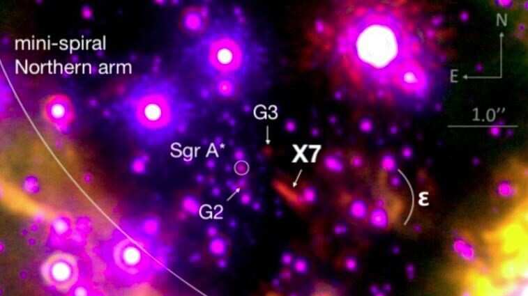 Los astrónomos de la Iniciativa Orbital del Centro Galáctico (GCOI) de la UCLA y del Observatorio Keck llevan siguiendo la evolución de este polvoriento filamento de gas desde 2002; las imágenes infrarrojas cercanas de alta resolución angular captadas con el potente sistema de óptica adaptativa del Observatorio Keck muestran que X7 se ha alargado tanto que ahora tiene una longitud de 3.000 veces la distancia entre la Tierra y el Sol (o 3.000 unidades astronómicas).