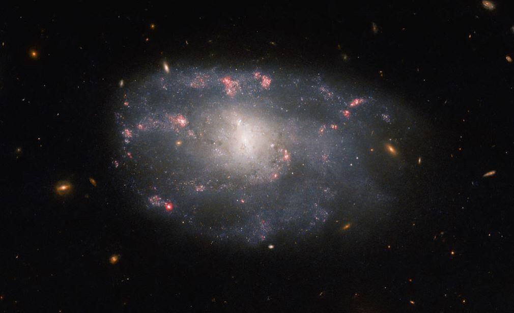 El tenue disco de la galaxia está salpicado de rosadas volutas de formación estelar, que destacan sobre el difuso resplandor del brillante núcleo de la galaxia, informa la NASA.