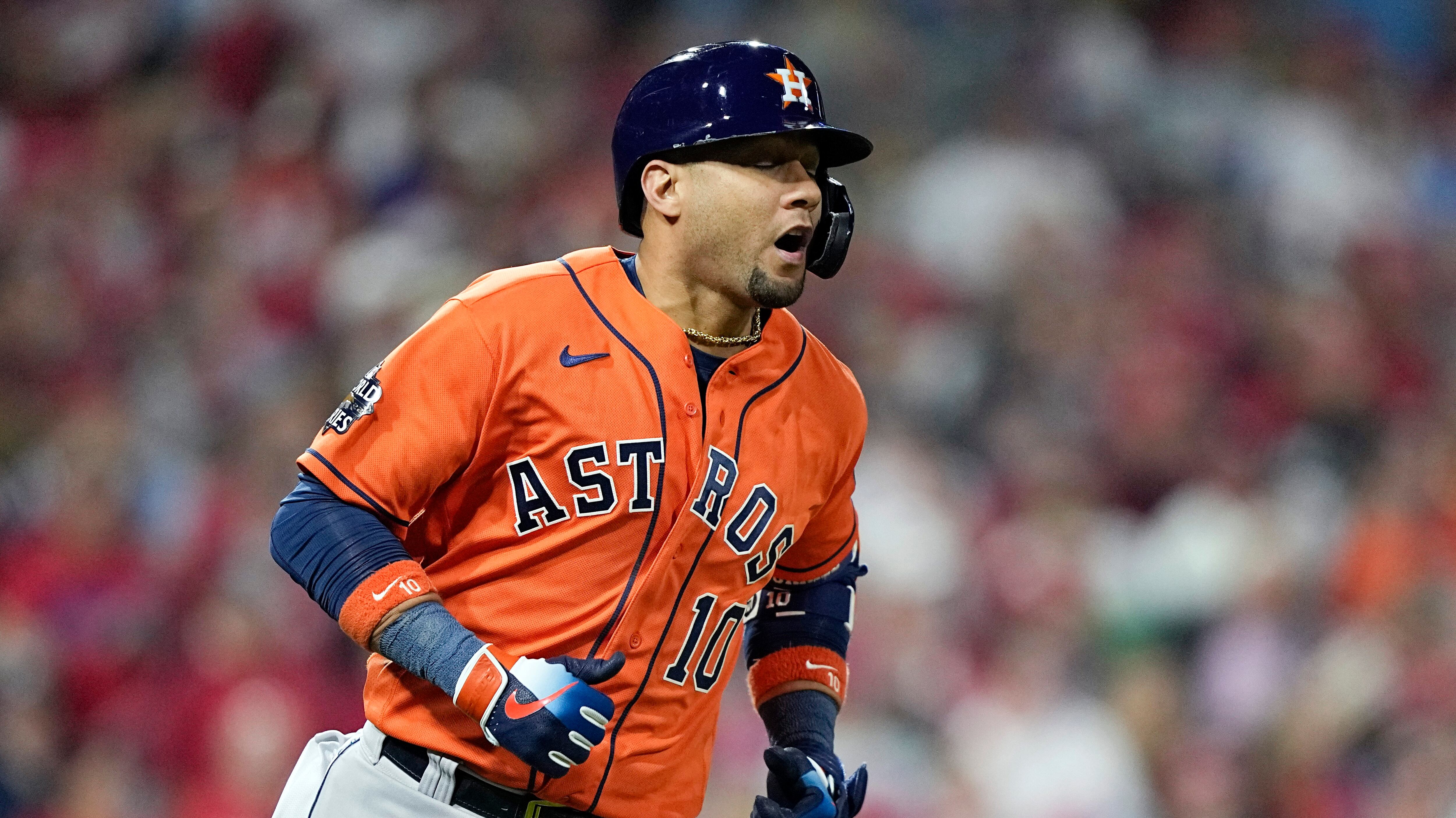 ARCHIVO - Foto del 2 de noviembre del 2022, el cubano Yuli Gurriel de los Astros de Houston reacciona a su remolcada sencilla en la quinta entrada del juevo 4 de la Serie Mundial ante los Filis de Filadelfia. (AP Foto/David J. Phillip, Archivo) AP (David J. Phillip/AP)