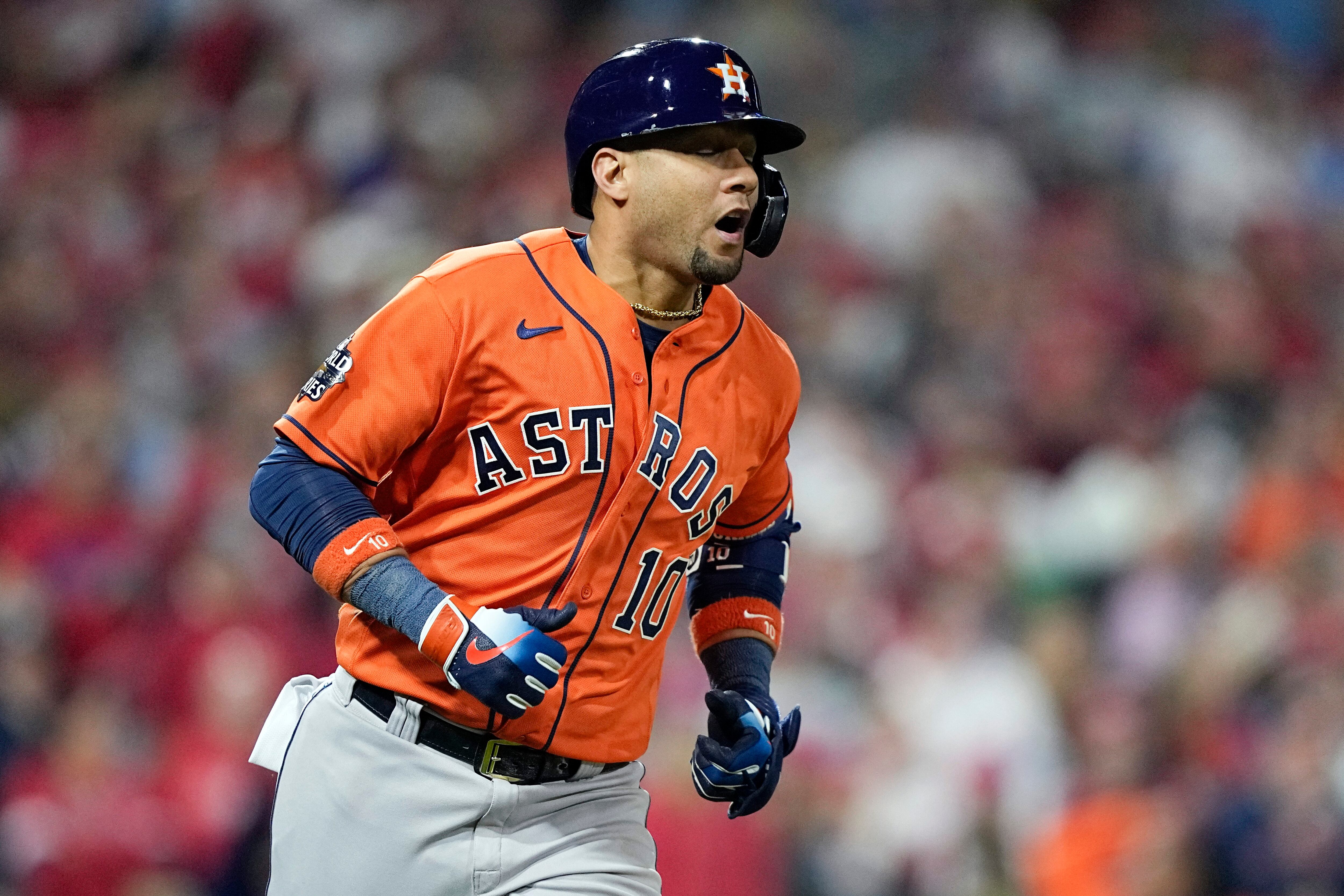 ARCHIVO - Foto del 2 de noviembre del 2022, el cubano Yuli Gurriel de los Astros de Houston reacciona a su remolcada sencilla en la quinta entrada del juevo 4 de la Serie Mundial ante los Filis de Filadelfia. (AP Foto/David J. Phillip, Archivo) AP (David J. Phillip/AP)