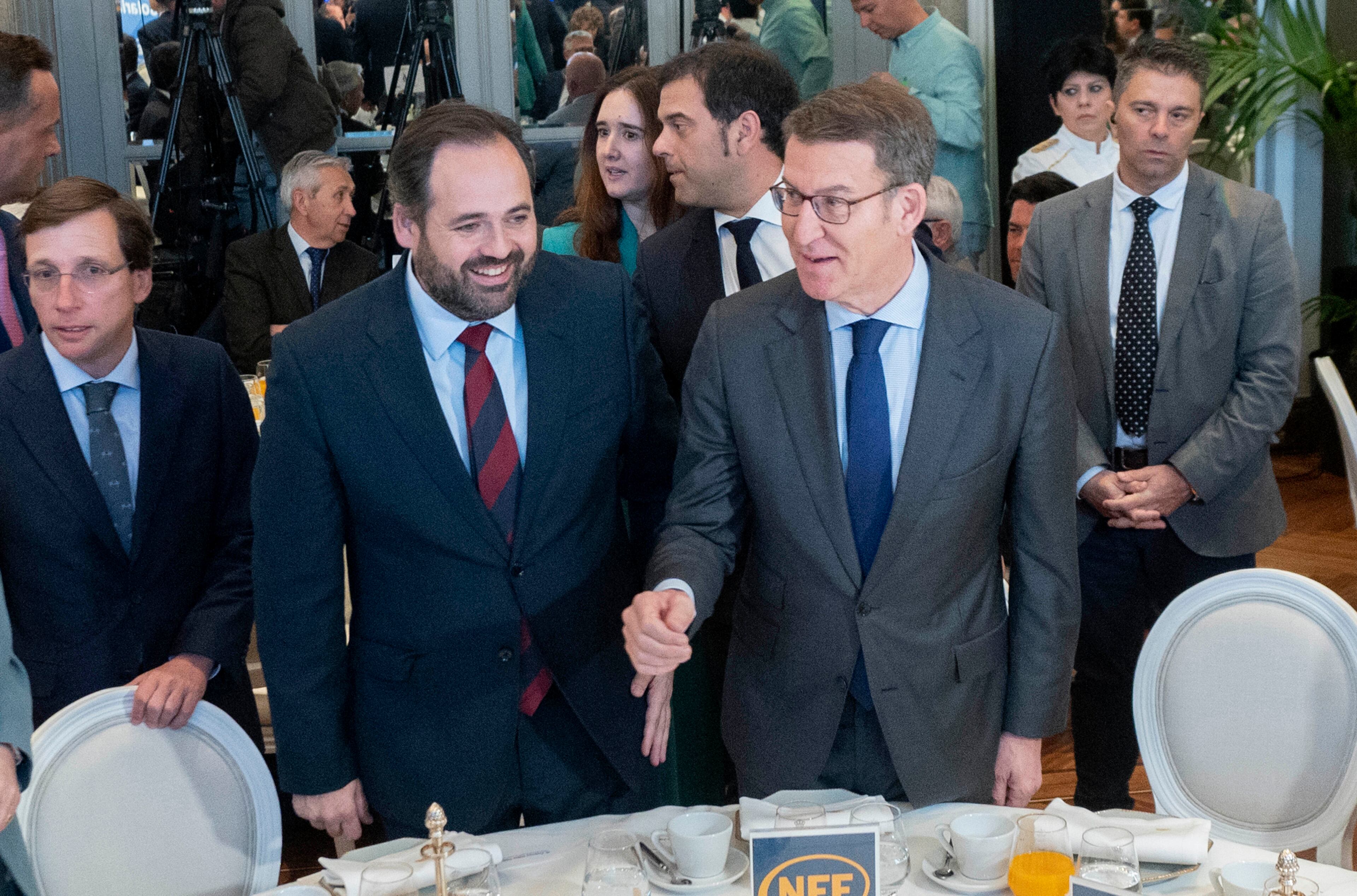 (I-D) El alcalde de Madrid, José Luis Martínez-Almeida; el presidente del Partido Popular de Castilla-La Mancha, Paco Núñez y el presidente del PP, Alberto Núñez Feijóo, durante un desayuno informativo de la tribuna Fórum Europa, en el Hotel Manda Alberto Ortega - Europa Press (Alberto Ortega - Europa Press/Europa Press)