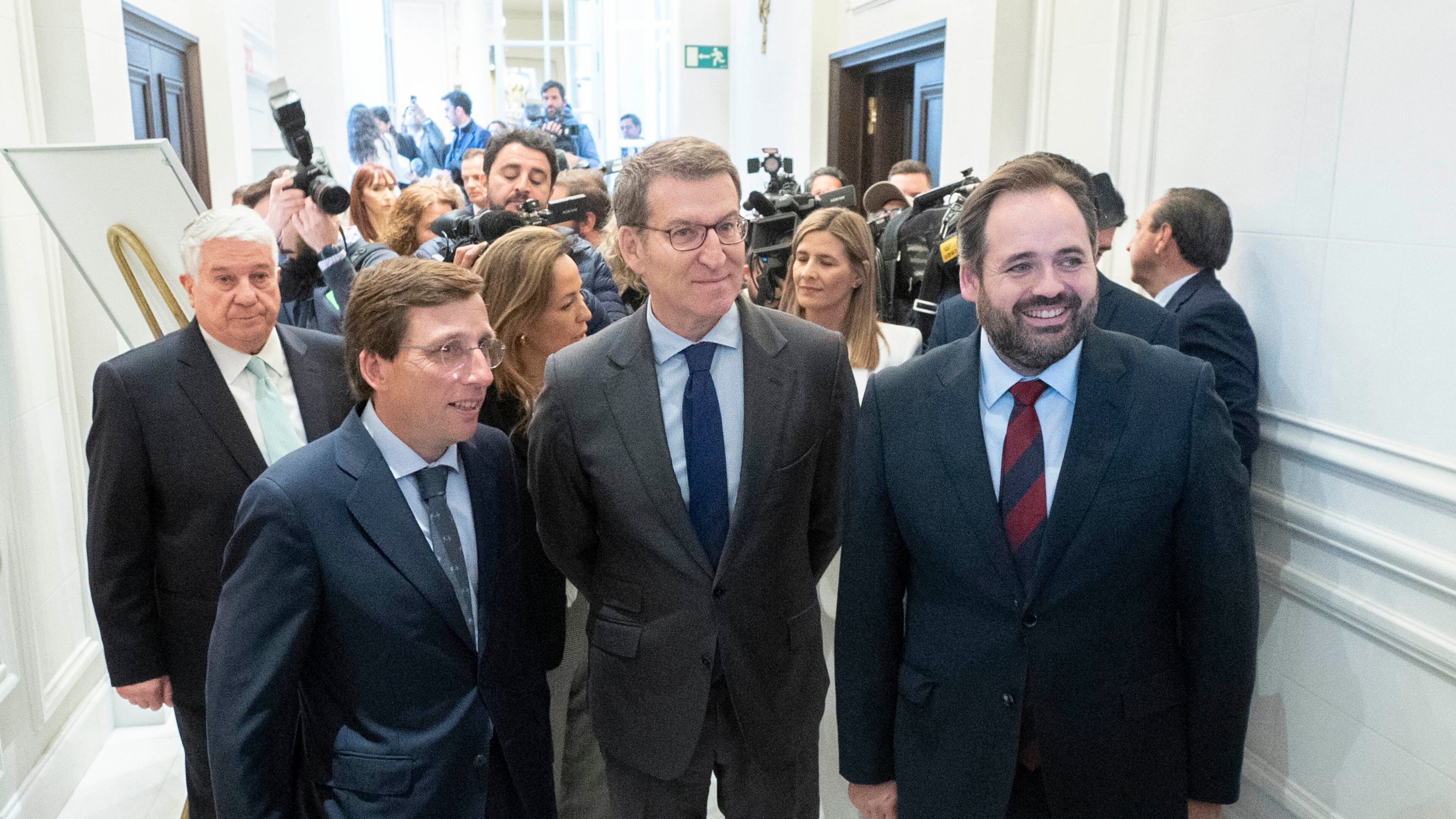 (I-D) El alcalde de Madrid, José Luis Martínez-Almeida; el presidente del PP, Alberto Núñez Feijóo y el presidente del Partido Popular de Castilla-La Mancha, Paco Núñez, a s u llegada a un desayuno informativo de la tribuna Fórum Europa, en el Hot Alberto Ortega - Europa Press (Alberto Ortega - Europa Press/Europa Press)