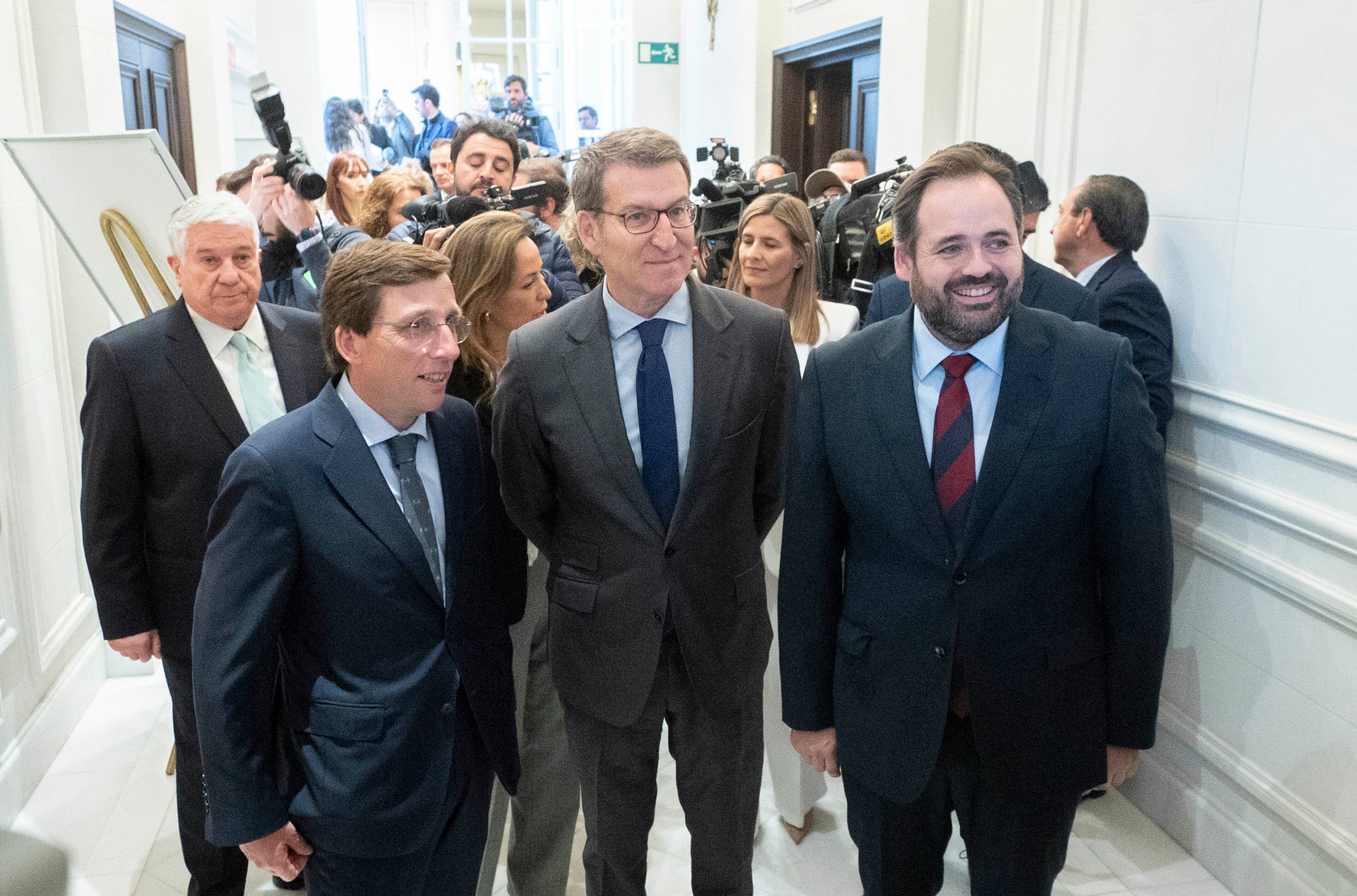 (I-D) El alcalde de Madrid, José Luis Martínez-Almeida; el presidente del PP, Alberto Núñez Feijóo y el presidente del Partido Popular de Castilla-La Mancha, Paco Núñez, a s u llegada a un desayuno informativo de la tribuna Fórum Europa, en el Hot Alberto Ortega - Europa Press (Alberto Ortega - Europa Press/Europa Press)