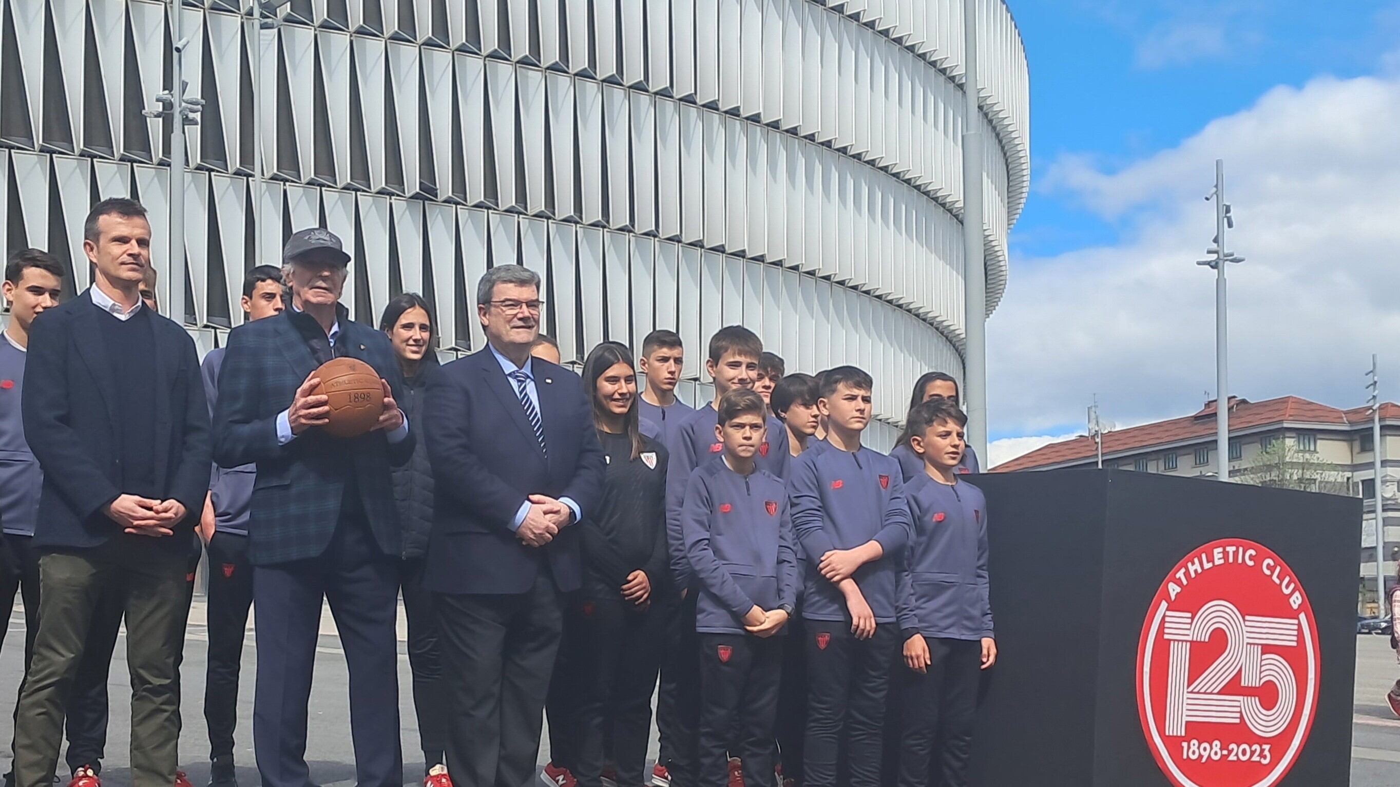 En la ubicación aproximada de la futura escultura se ha colocado un cubo de madera con el logo del 125 aniversario del Athletic Club. Además, una representación de la cantera de Lezama, compuesta por una veintena de jóvenes porteros y porteras de todas las categorías inferiores, ha arropado a Iribar.