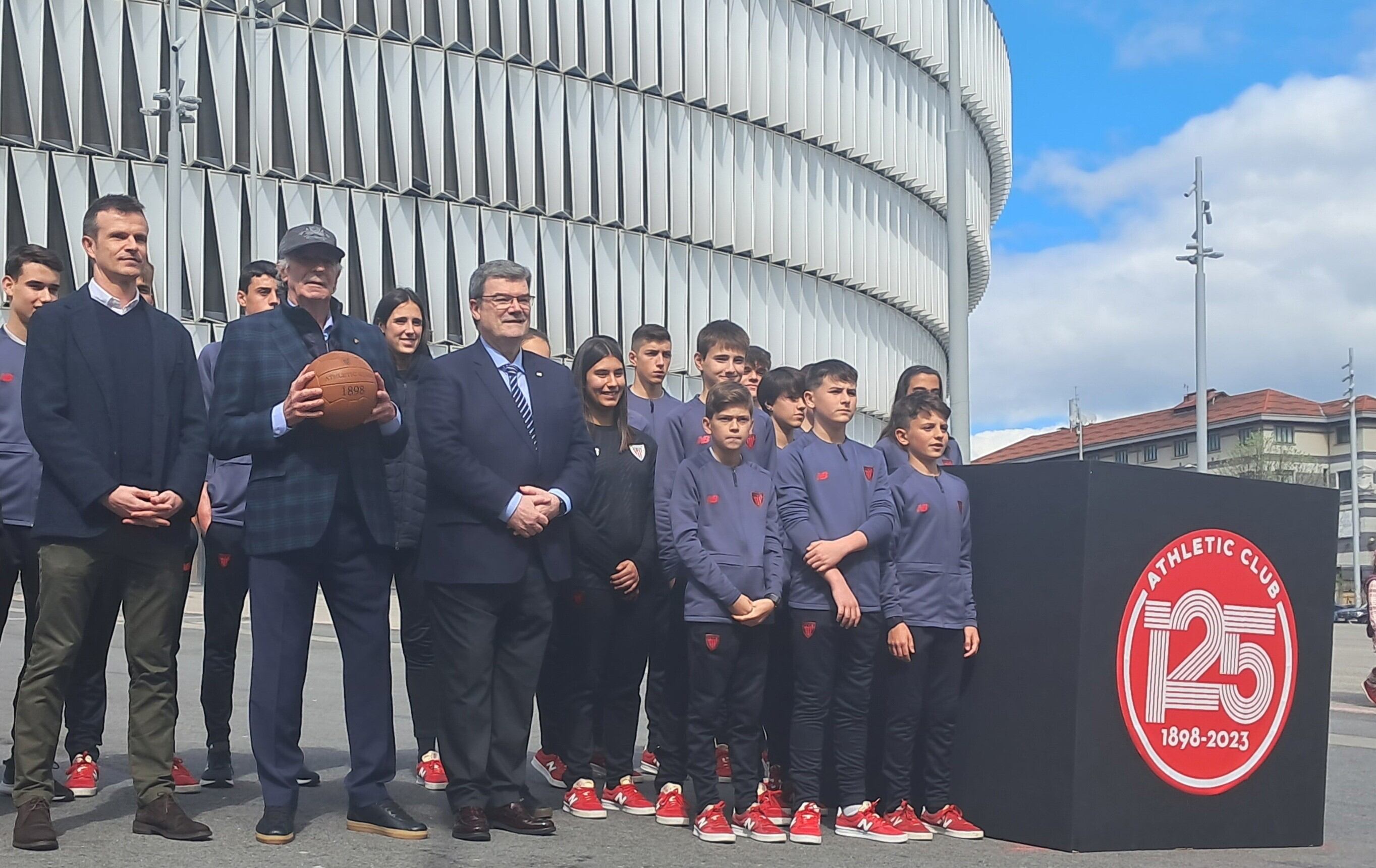 En la ubicación aproximada de la futura escultura se ha colocado un cubo de madera con el logo del 125 aniversario del Athletic Club. Además, una representación de la cantera de Lezama, compuesta por una veintena de jóvenes porteros y porteras de todas las categorías inferiores, ha arropado a Iribar.